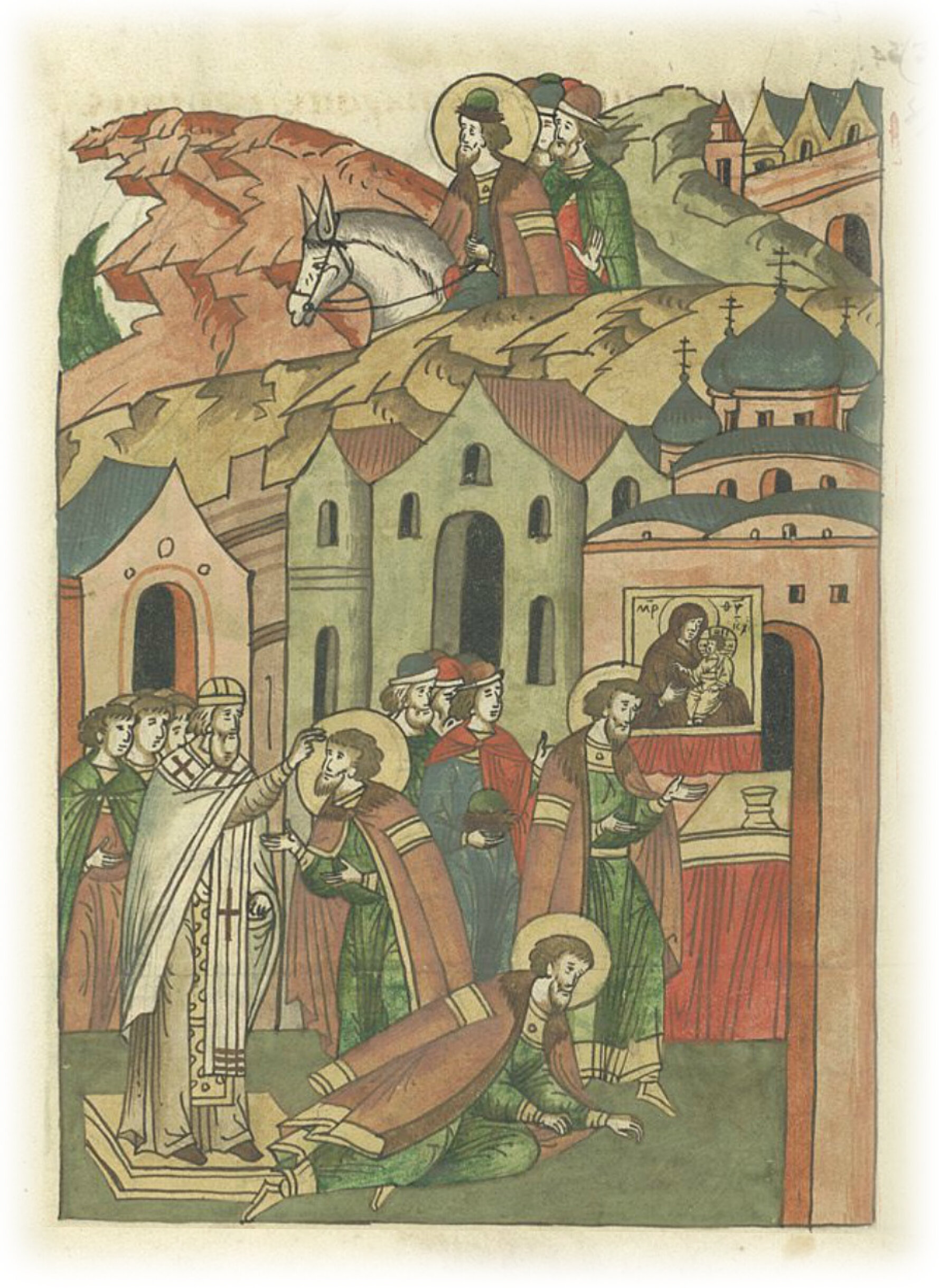 И пришел в Ростов, и ударил челом Пречистой Богородице, и знаменался у святого образа Ее, и благословился у отца своего, у Кирилла епископа, глаголя так: «Отче, господине, твоею молитвою в Новгород въехал в добром здоровье, и опять из Новгорода сюда приехал в добром здоровье».