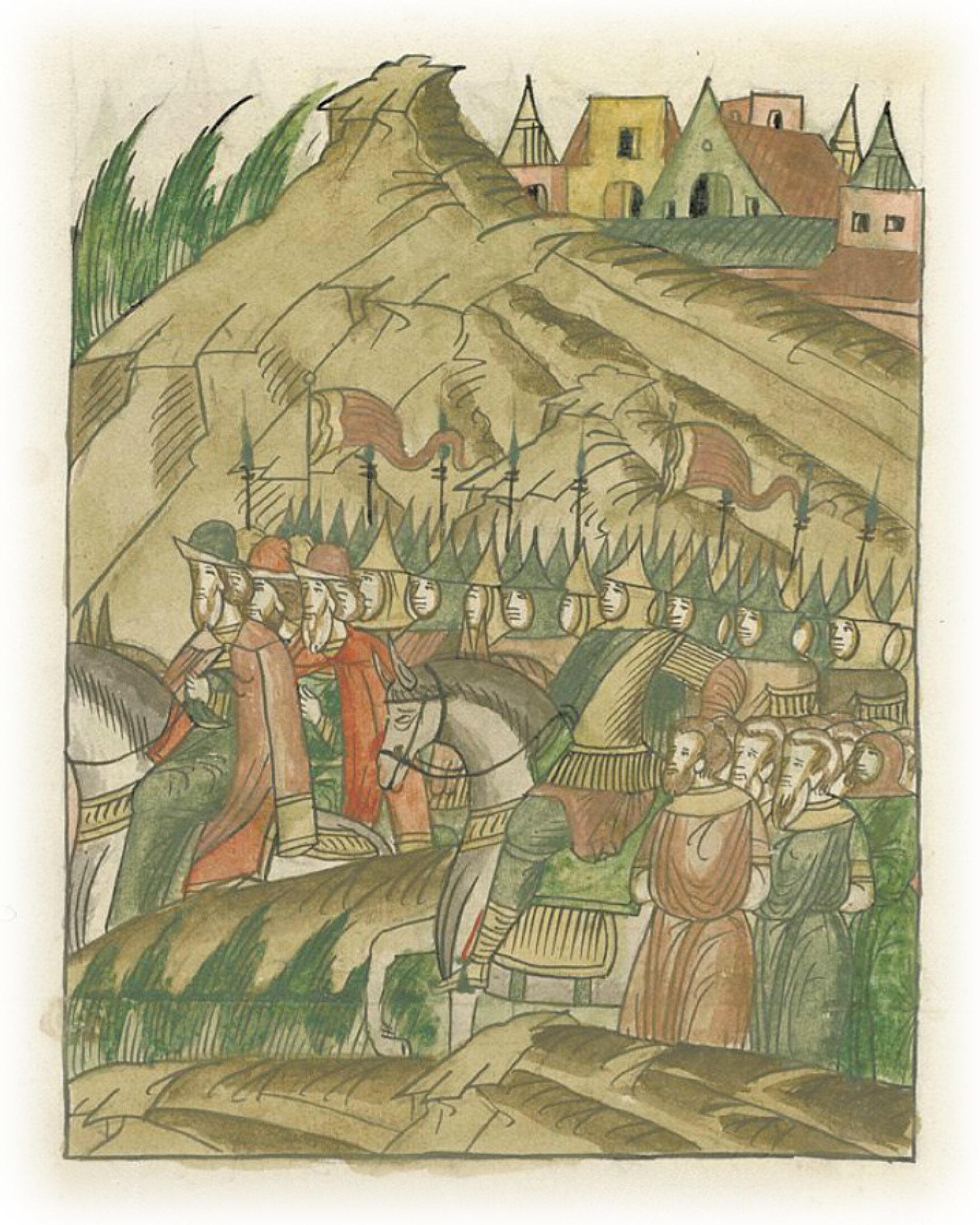 Войско великого князя Ивана Васильевича возвращается из Немецкой земли с большим числом пленных и добычей.