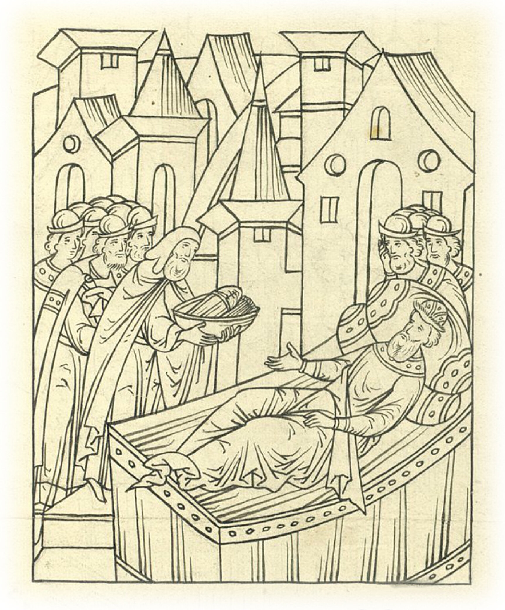 Старец Мисаил Сукин приносит великому государю Василию Ивановичу иноческое одеяние.