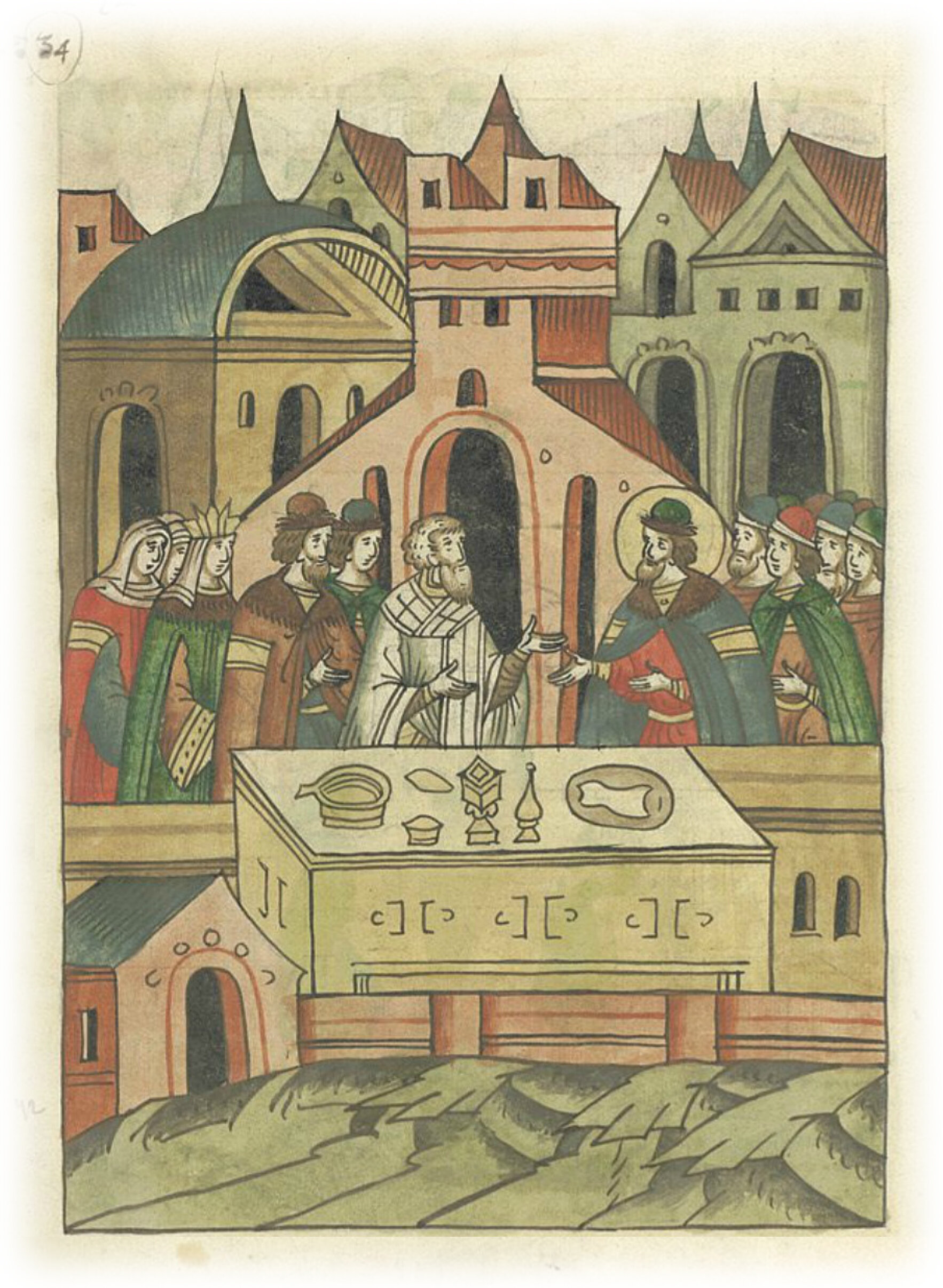 Епископ Кирилл, великая княгиня и князья Борис и Глеб чествуют князя Александра Ярославича в Ростове.