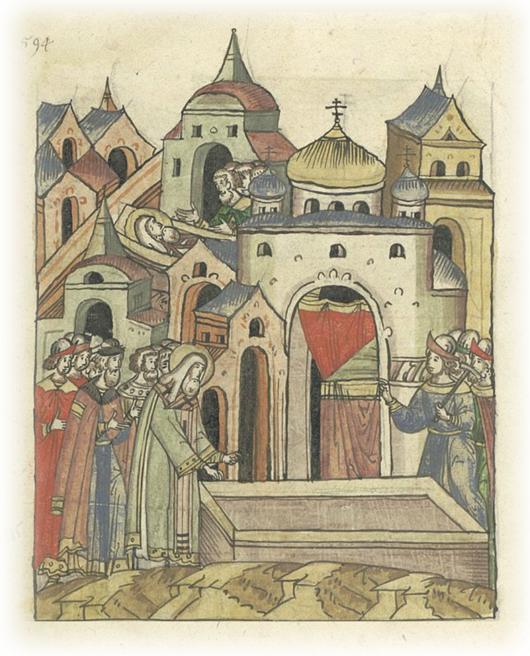 В том же году преосвященный Петр, митрополит Киевский и всея Руси, заложил в Москве, на площади у своего двора, соборную церковь, первую каменную – во имя Успения святой Богородицы, при князе Иване Даниловиче, внуке Александрове, и заложил себе гроб своими руками в стене, близ жертвенника, где позднее и был положен. Он и поныне там лежит, творя многие чудеса людям, с верою приходящим к нему.