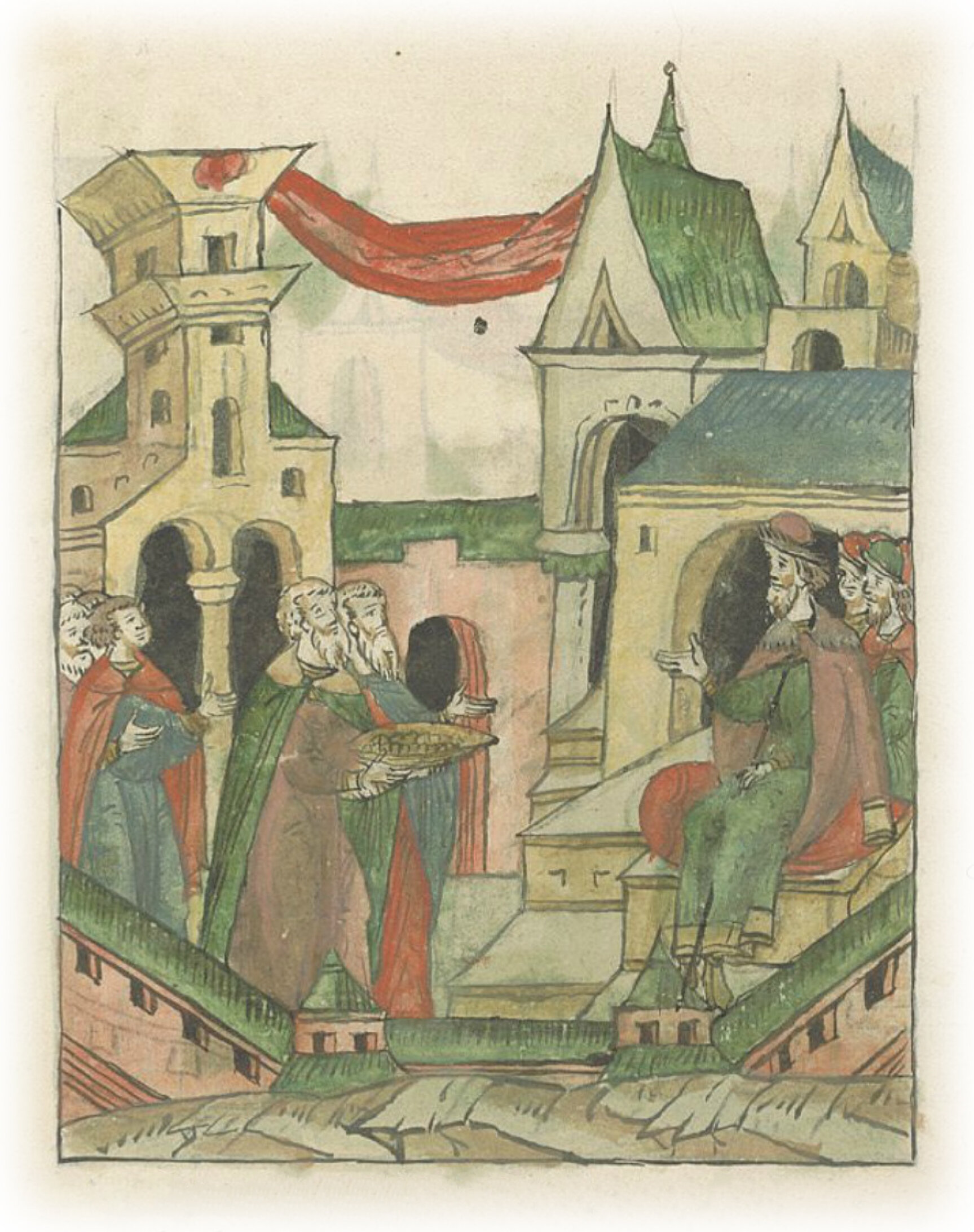 Посадник Фома и тысяцкий Василий Есипов дарят великому князю Ивану Васильевичу 1000 рублей от тех посадников и тысяцких, которые не успели учинить пиры в честь великого князя.