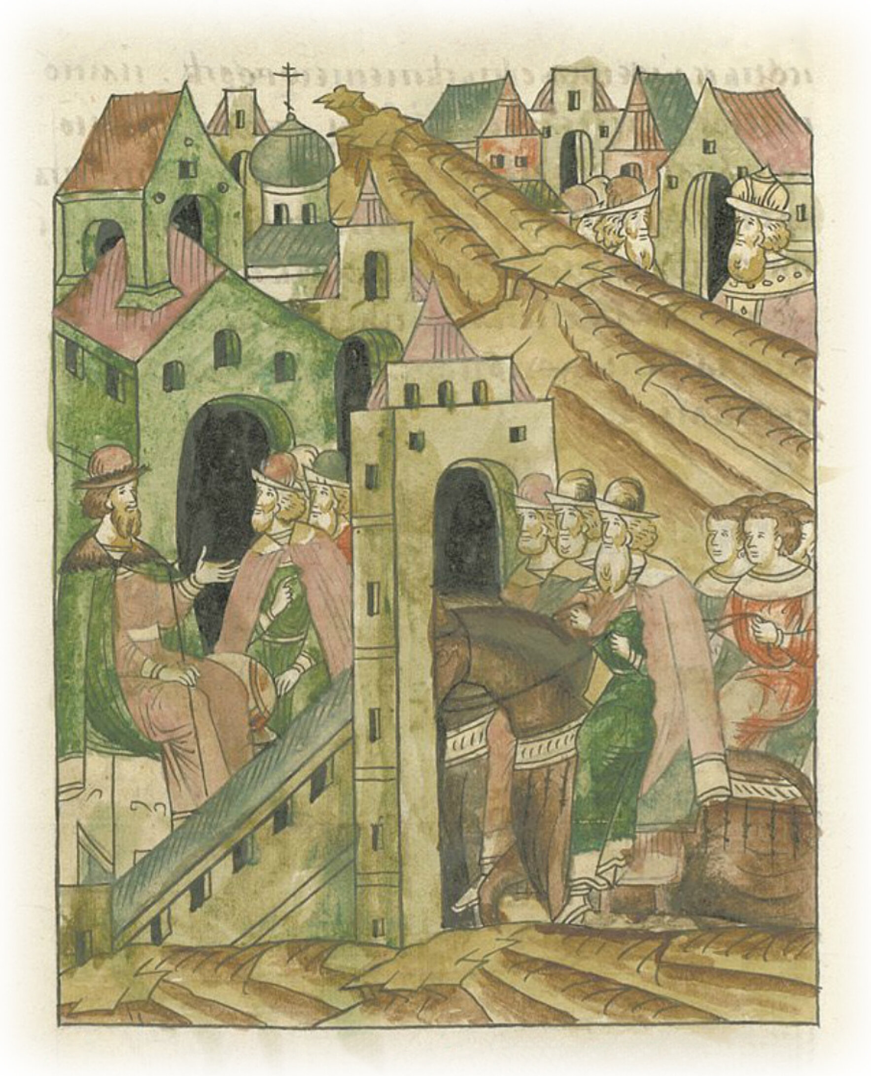 О приходе послов великого князя из Рима. В то же лето (месяца) июля вернулись в Москву послы князя великого от короля Римского Максимилиана, Юрий Грек Траханиот, Михайло Кляпик и Иван Волк Курицын.
