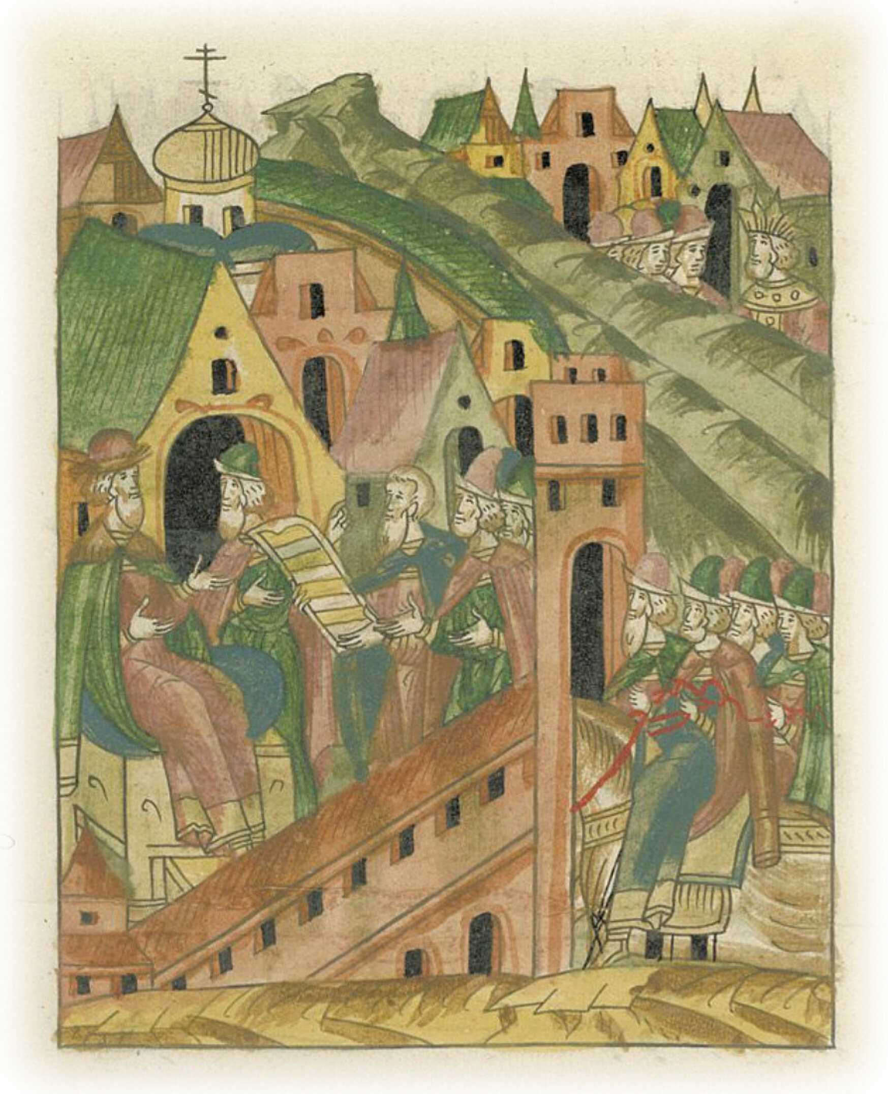 О приходе послов из Крыма. В том же месяце октябре в 12 день в четверг пришел из Крыма Константин Григорьевич Заболоцкий и привез к великому князю Василию Ивановичу всея Руси от царя Менли-Гирея клятвенную грамоту, какая была необходима великому князю и какая была с его отцом великим князем Иваном Васильевичем всея Руси (подписана).