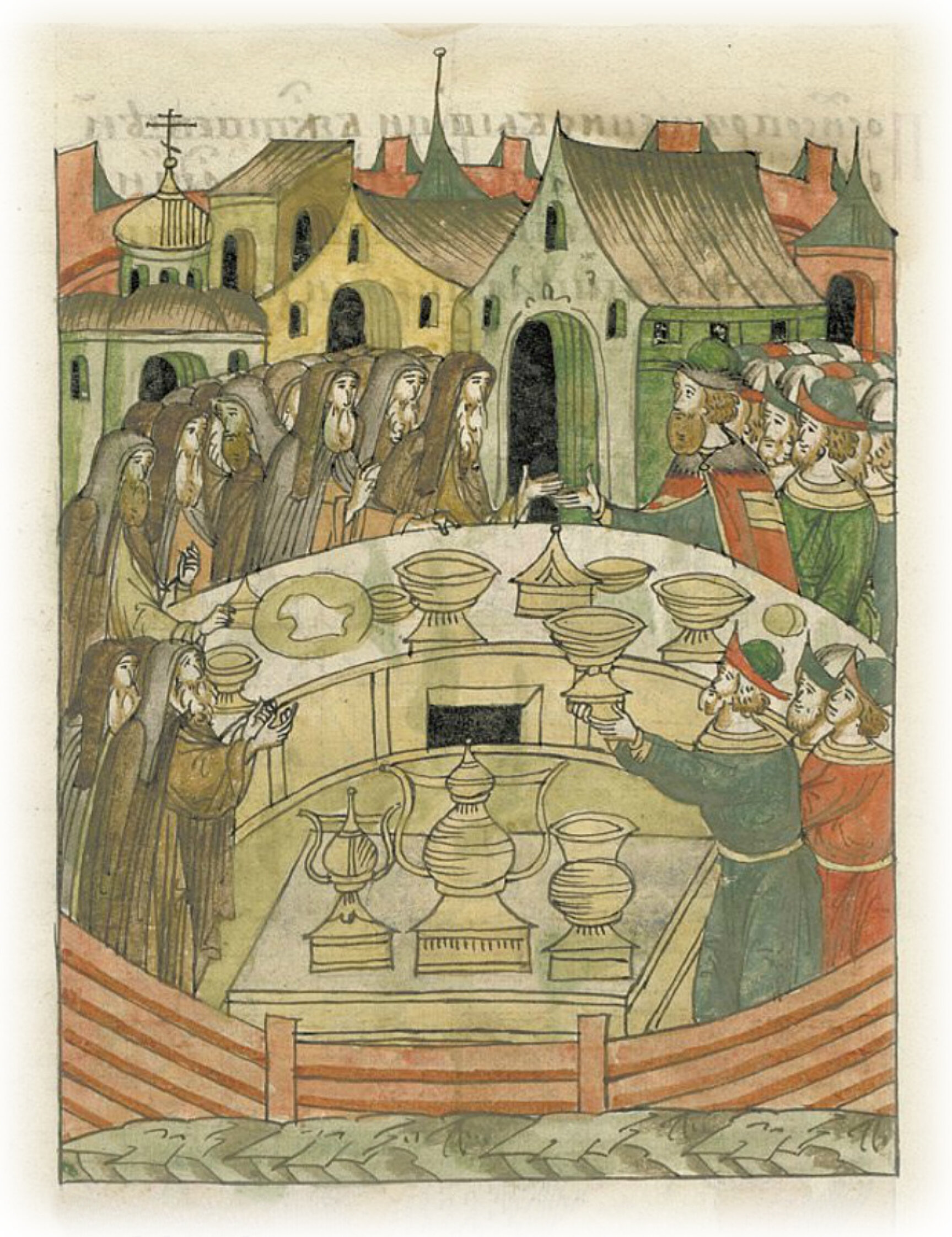 Великий князь Василий Иванович воздает милостыню в обители чудотворца Сергия и пирует с братией.