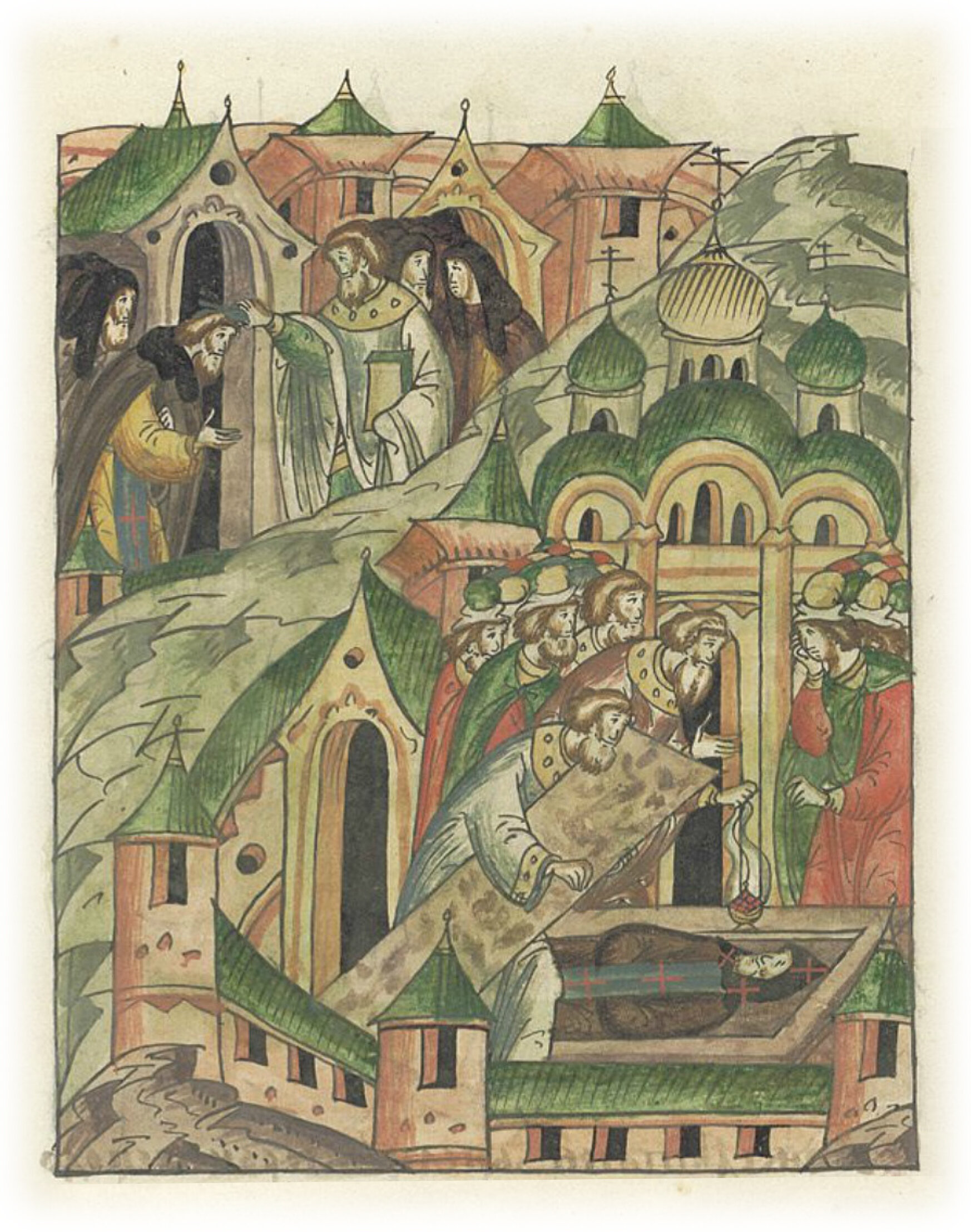 Кончина князя Владимира Всеволодовича и его похороны в церкви пречистой Богородицы Златоверхой во Владимире.