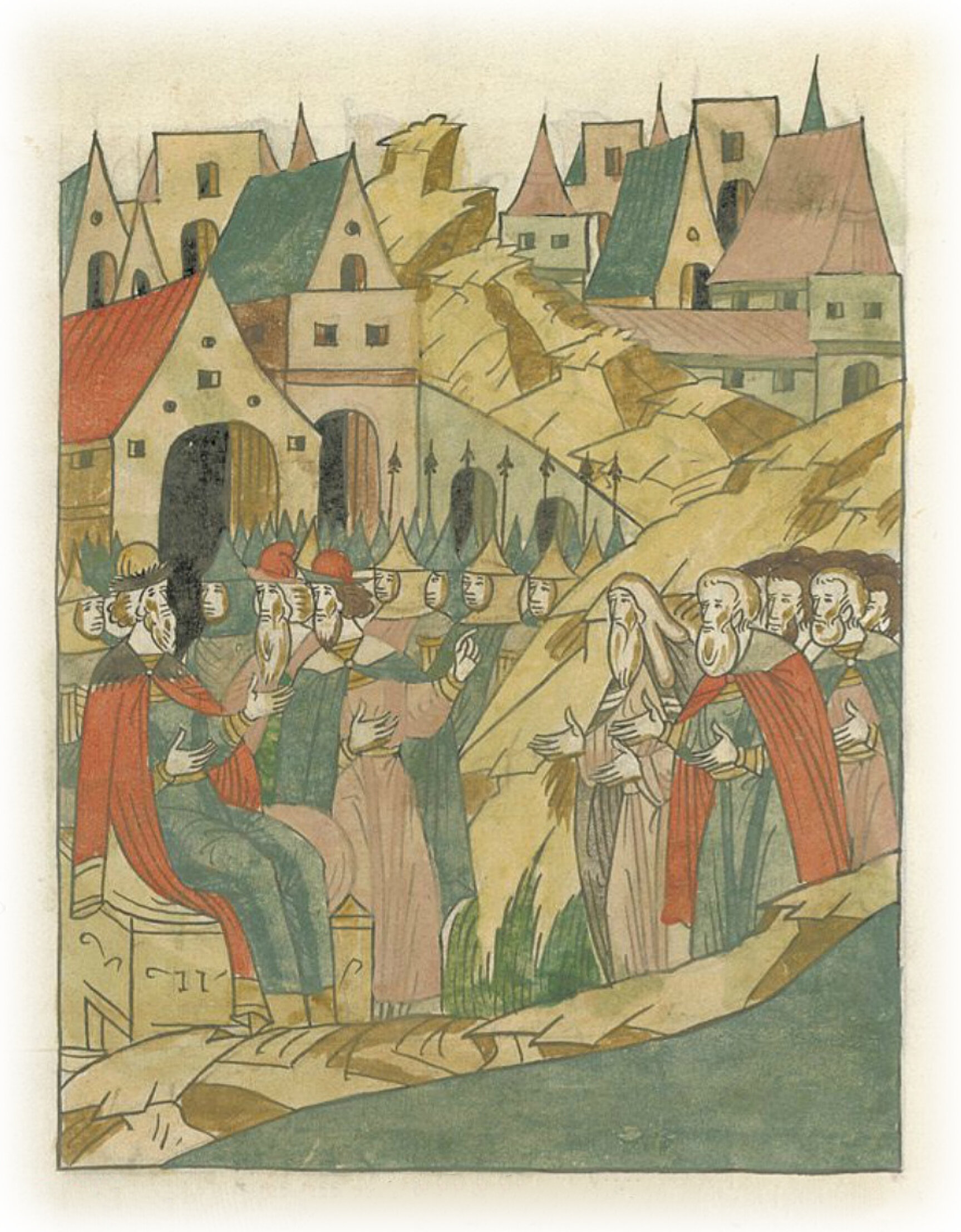 Новгородский владыка Феофил и посадники приходят к великому князю Ивану Васильевичу в Паозерие к церкви Троицы.