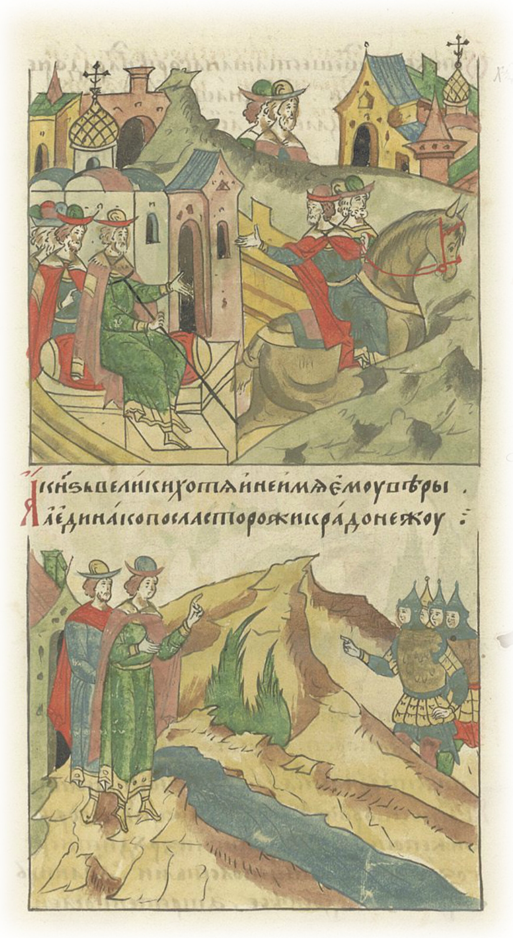 А князь великий, хотя и не имел ему веры, но, однако, послал стражников к Радонежу. Они же, придя, встали на горе над Радонежем стеречь. И узнали их ратные стражи (князя Ивана) издалека, а они тех ратных не усмотрели и не поверили тем вестям