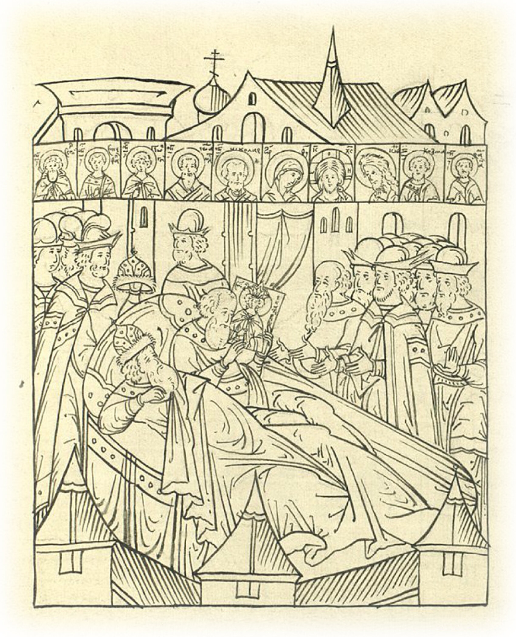 Были же у него поставлены многие принесенные чудотворные иконы. И тут была икона великомученицы Екатерины, на которую смотрел неуклонно и с радостным лицом, говоря: «Государыня великая Екатерина, – говорит, – пора нам царствовать». И сказал это трижды, и пробудился, как от сна, и взял икону великомученицы Екатерины, и любезно приложился к ней, и коснулся рукою правою к образу ее, потому что в то время рука у него была больна.