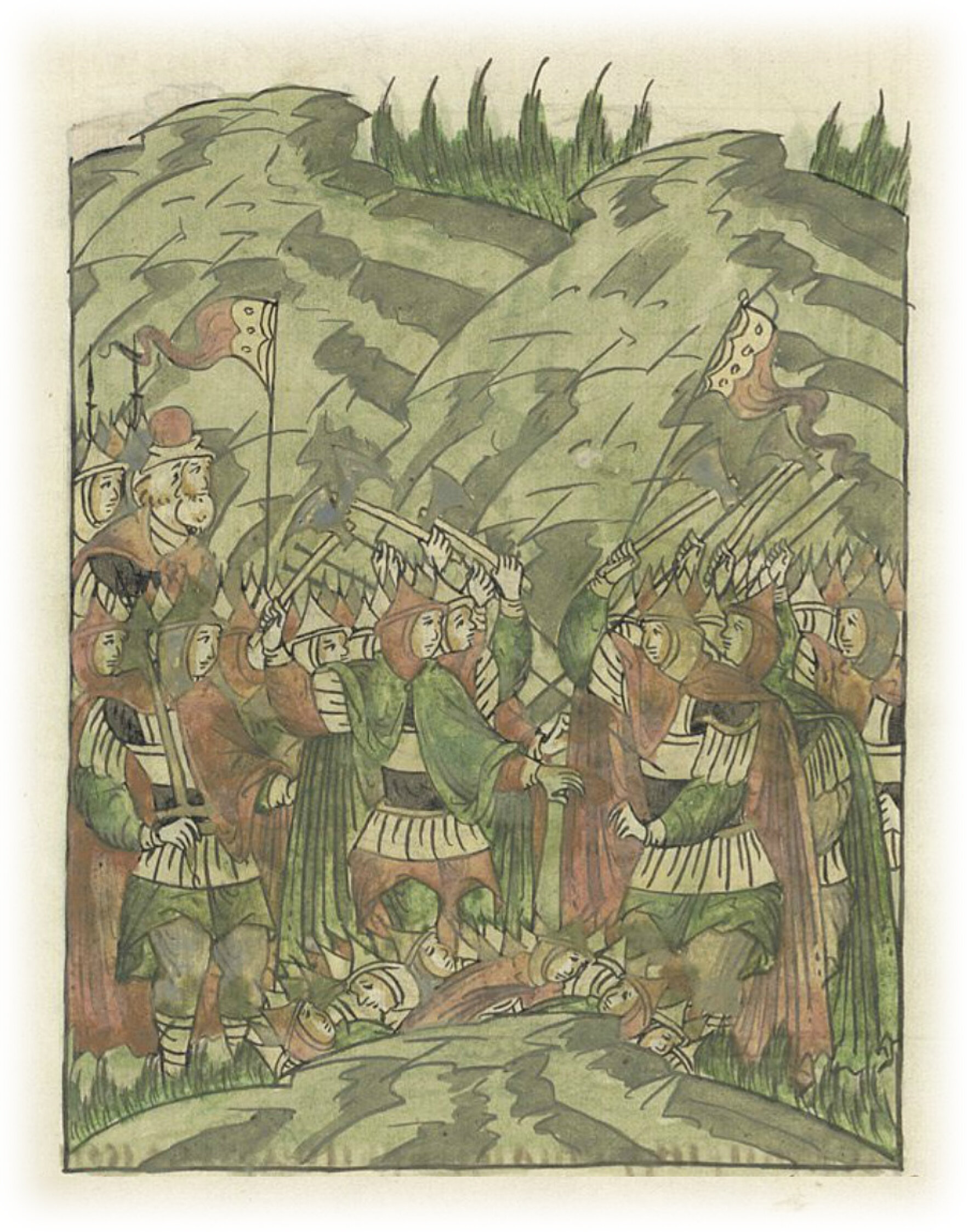 О побоище князя Ярослава Всеволодовича с князем Новгородским Мстиславом Мстиславичем у Липицы. Пешие новгородцы ударяют на ярославских пеших с топорами и сулицами и в ходе битвы подсекают стяг князя Ярослава Всеволодовича.