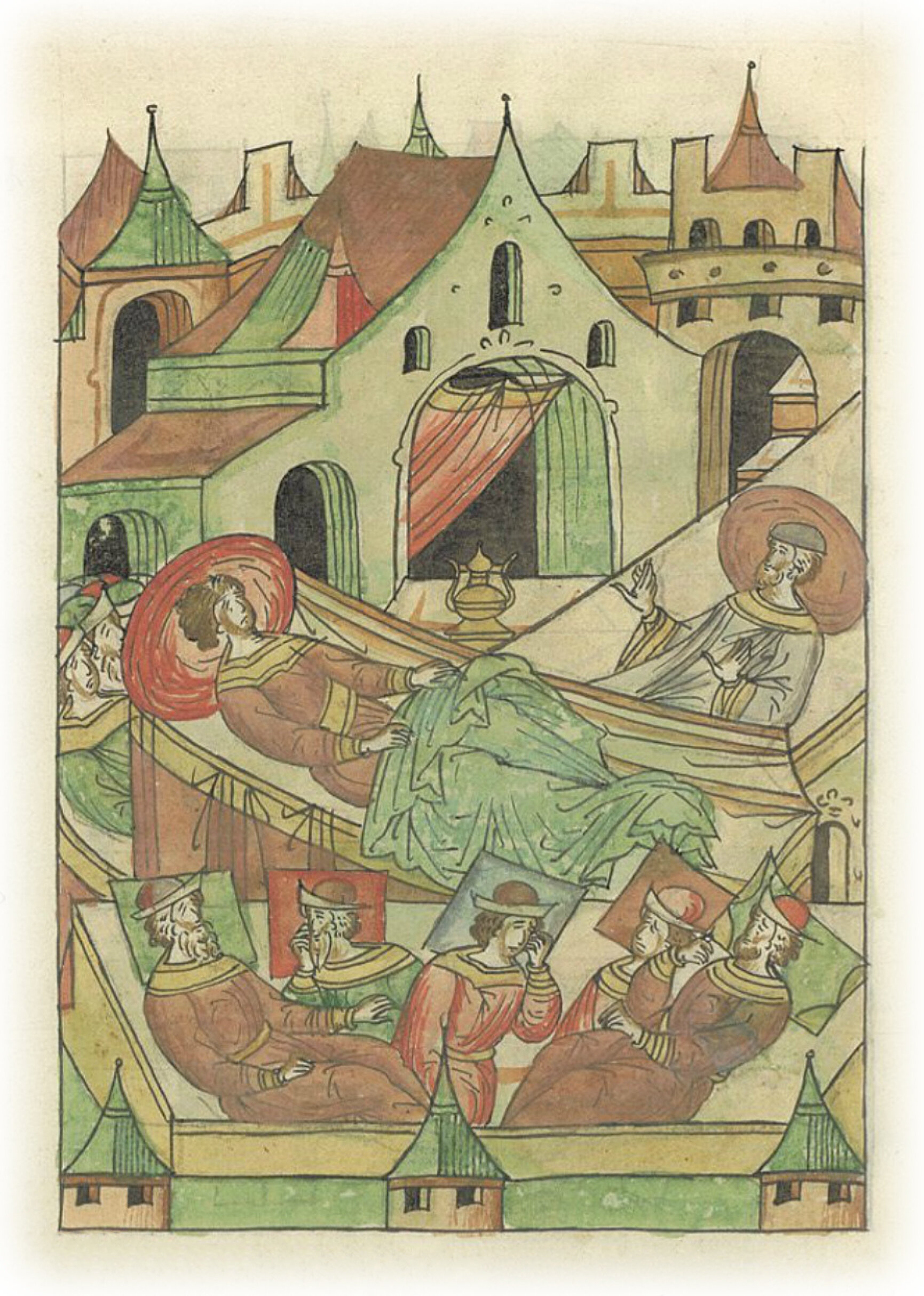 О кончине князя Дмитрия Юрьевича Красного. Умерший князь откидывает покрывало со своей головы и произносит фразу «Петр узнал Его, Кто есть Господь».