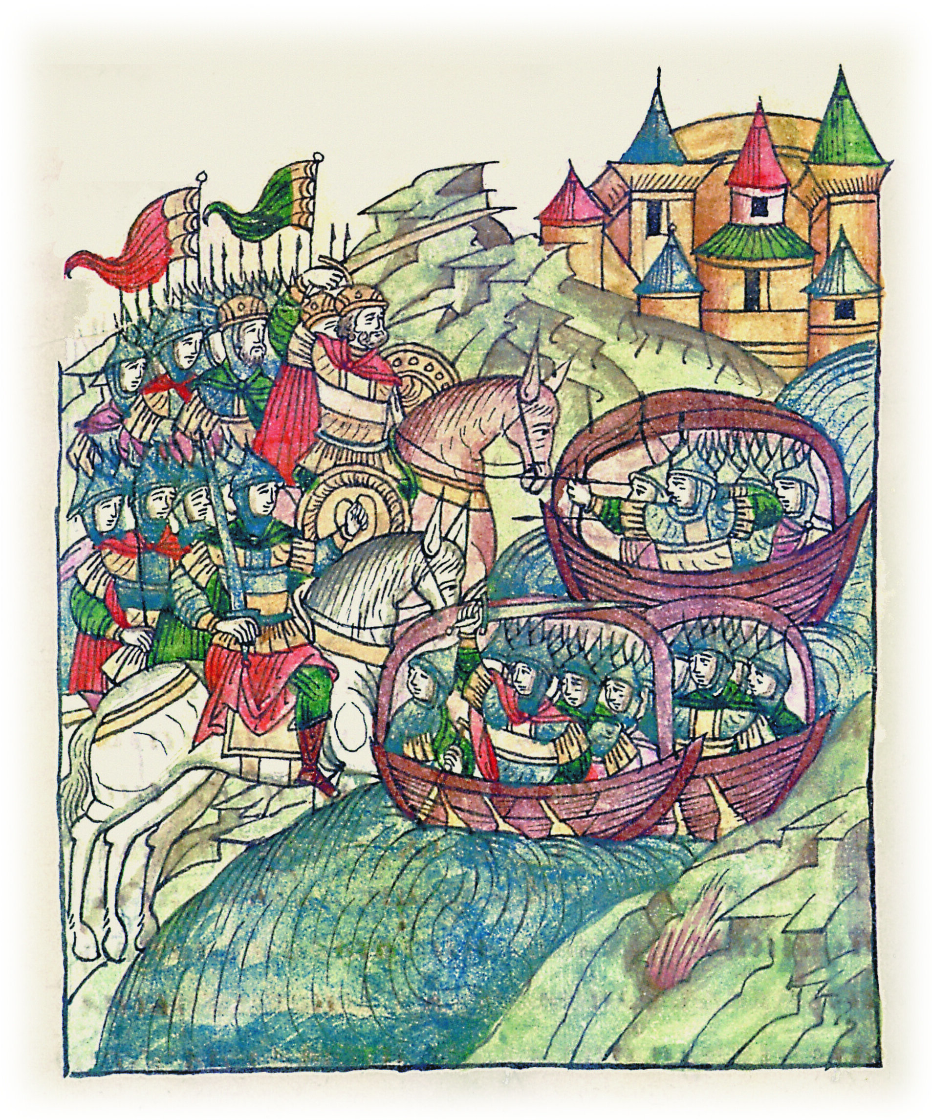 и были быстры словно птицы, и стояли в доспехах, и стреляли как хотели; в каждой ладье по два кормщика было - один на корме, а другой на носу, и шли, как хотели, кормой или носом, не поворачивая ладьи, и был бой их страшен супостатам.