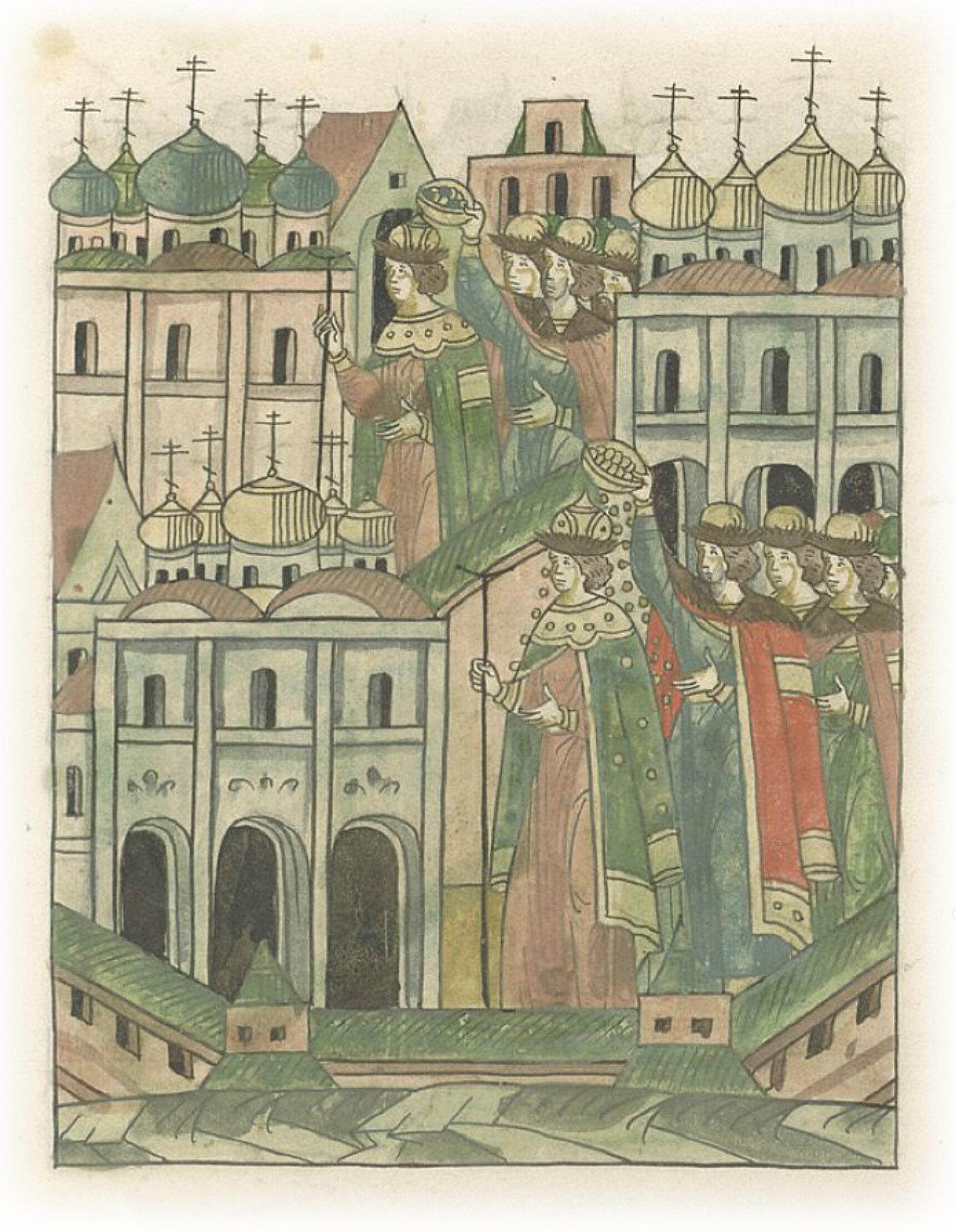 также трижды осыпал его перед (церковью) архангела (Михаила) и перед (церковью) Благовещения (Богородицы) золотыми и серебряными деньгами.