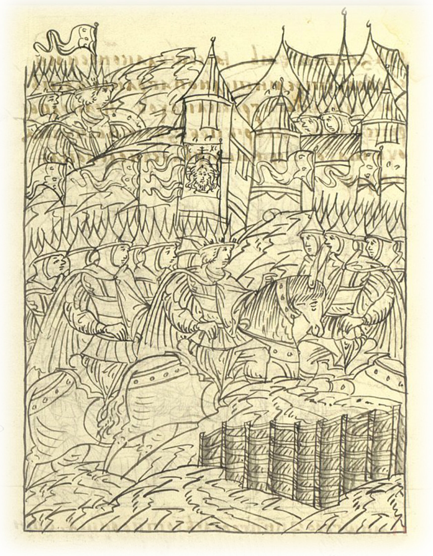Языки говорят воеводам царя Ивана Васильевича, что магистр окопался большим рвом вокруг города Рындола, бьет из пушек и пищалей и приступает к Рындолу.