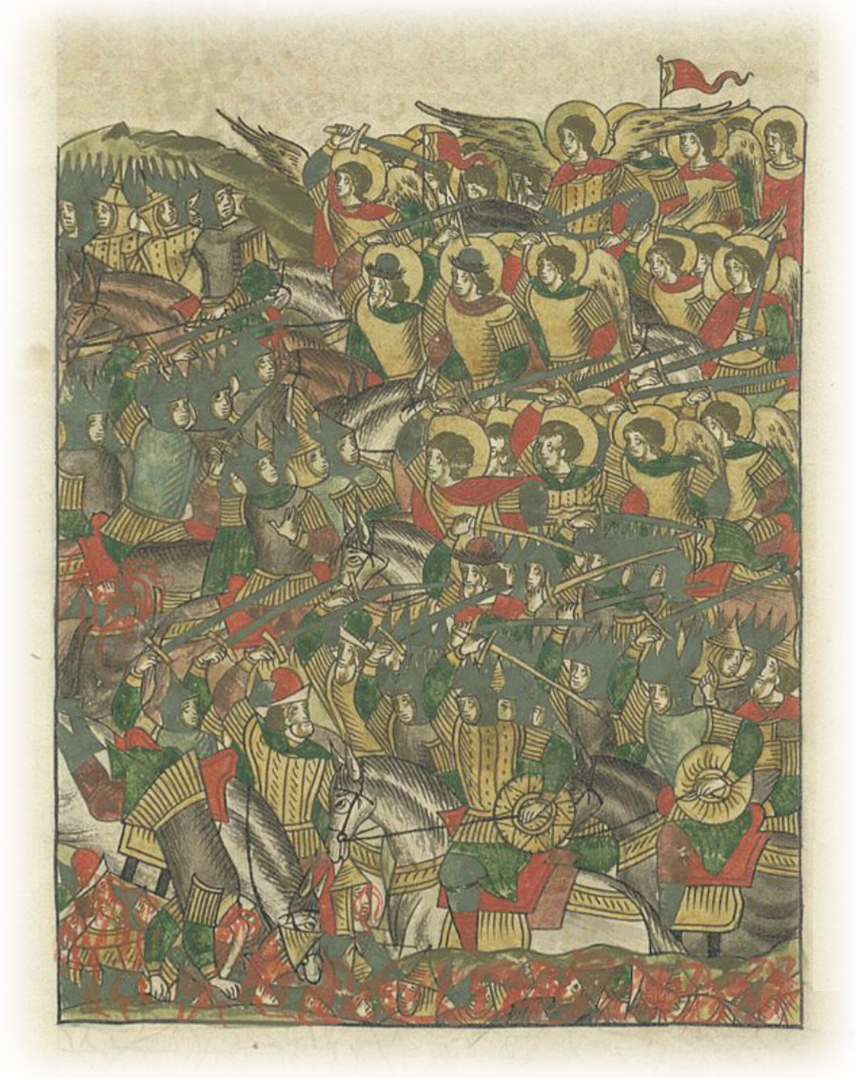 Видели верные, что ангелы помогают христианам, и святых мучеников полки, и воина великого Христова Георгия, и славного Димитрия, и великих князей русских, святых Бориса и Глеба, у них же был воеводой совершенного полка небесных сил великий архистратиг Михаил.