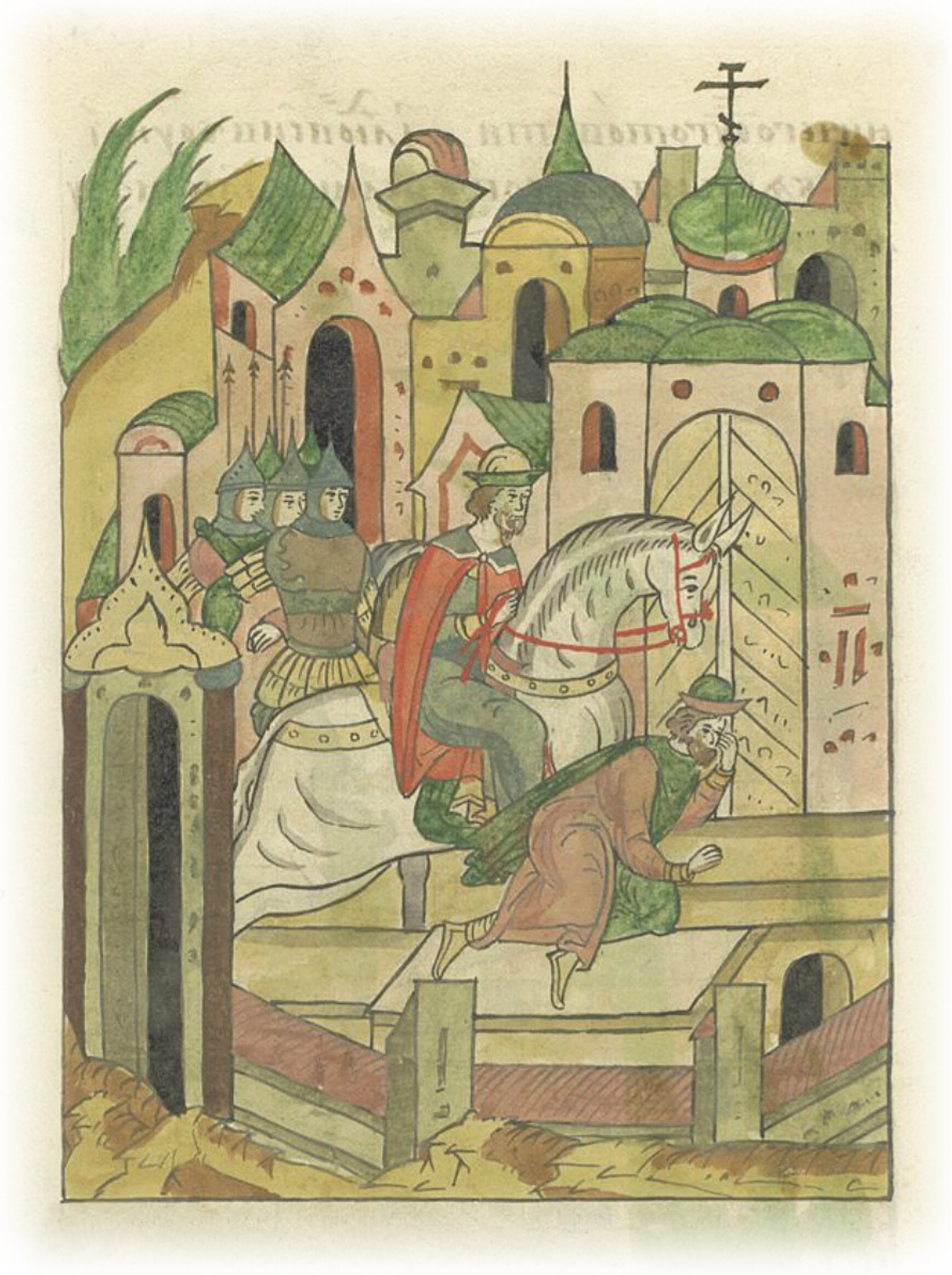 А эти убийцы, словно свирепые волки, въехали в монастырь на конях, раньше всех Никита Константинович, и по лестнице на конях к передним дверям церковным. И (только) тут сошел он с коня, и споткнулся о камни, которые перед дверями церковными лежали на крыльце.