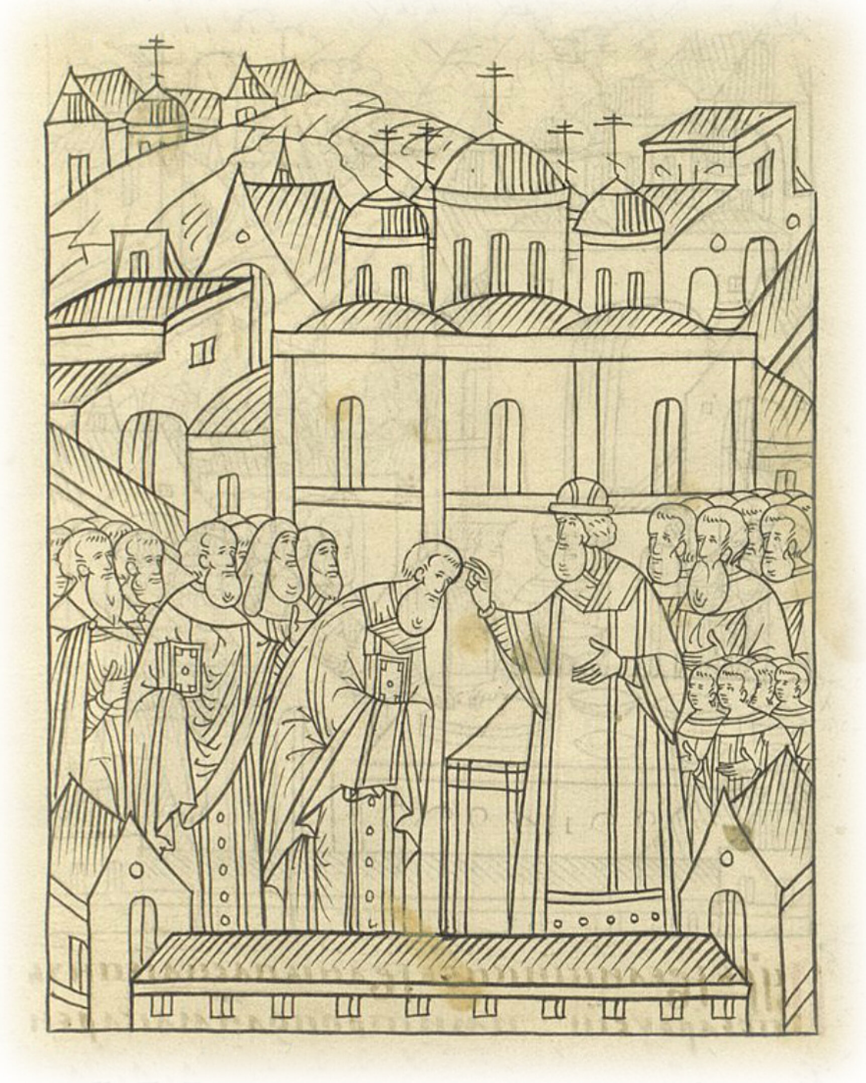 Митрополит Макарий ставит архиепископом в Великий Новгород и Псков Пимина Черного.