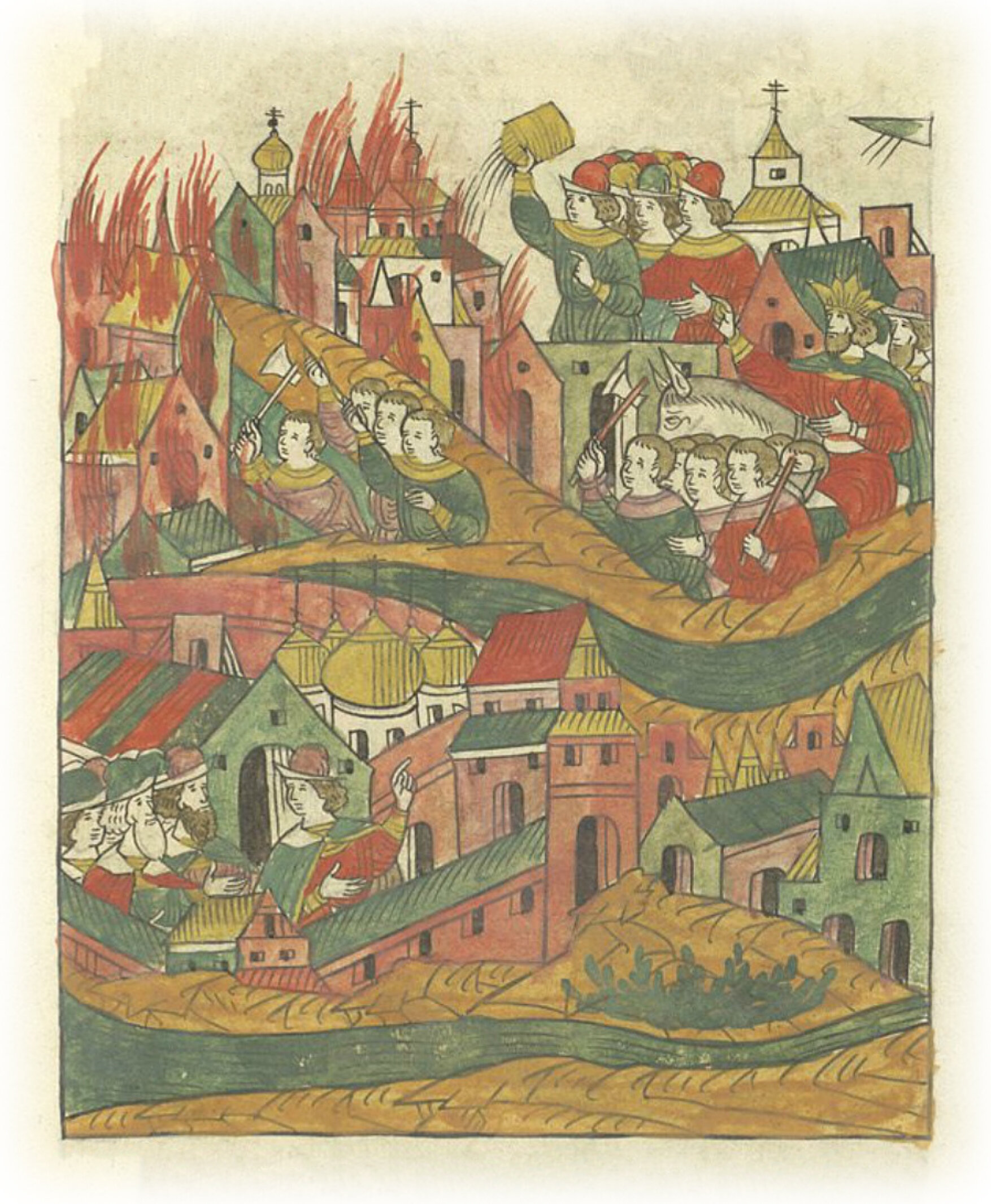 В тот же день на восьмом часу дня загорелся за Неглинкой по Дмитровской улице двор подъячего Русина Колобынина, и погорело в тот день многое множество храмов и дворов; и едва царь и великий князь с князем Владимиром Андреевичем, с боярами и с двором своим, со стрельцами и со множеством народа с большим трудом с Божьею благодатью угасили огонь.