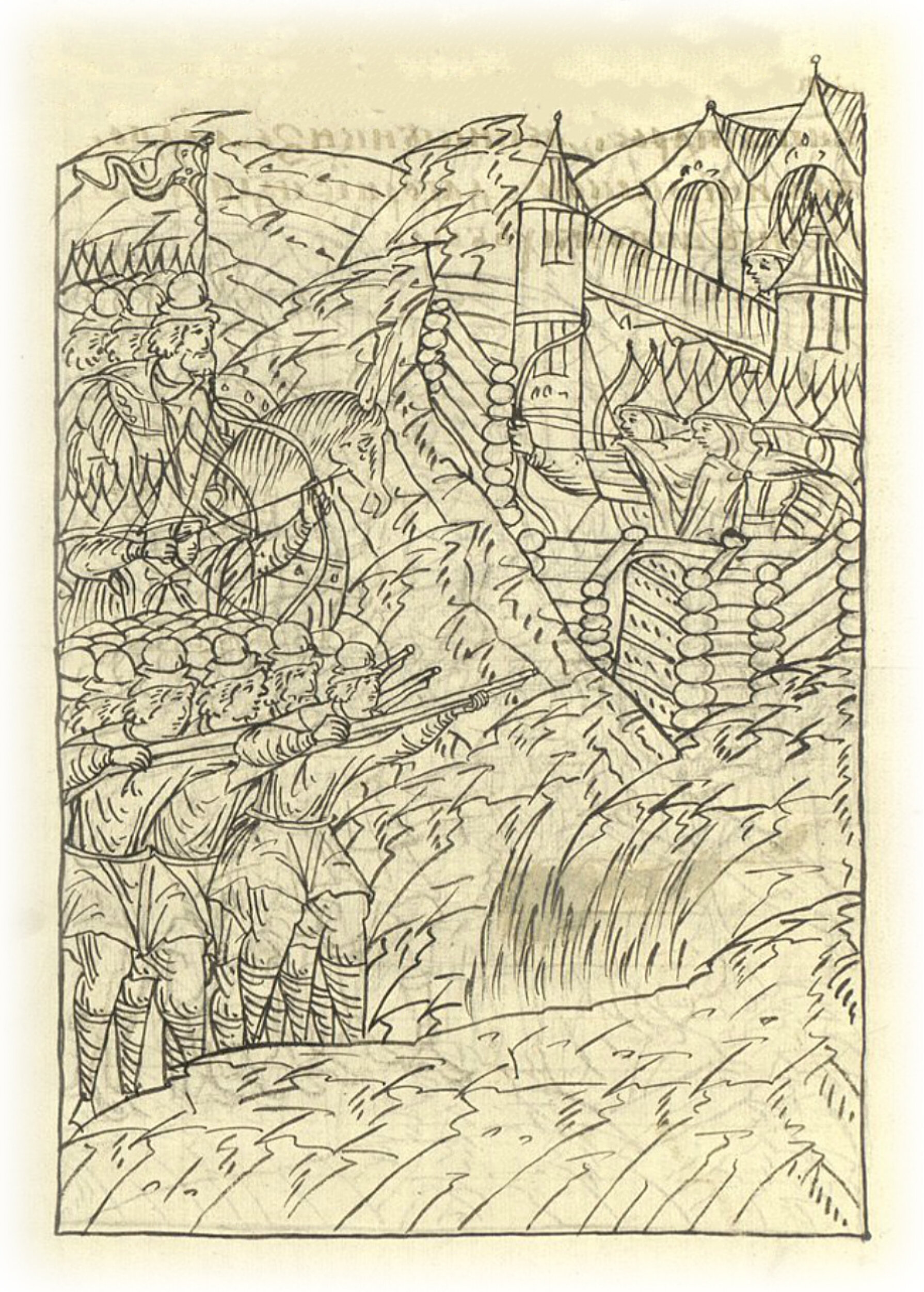 О взятии острога. И воеводы начали говорить детям боярским от имени царя: «Постарайтесь и послужите Богу и государю, все устремитесь на нечестивых!» Князь Семен Иванович и Данило Романович приблизились к воротам острога и велели детям боярским пешим пойти к острогу; головы же царского полка и сами с коней сошли и пошли к острогу. И начали приступать к острогу. Стрельцы из множества пищалей стреляли, христиане и татары – из луков. И стрелы, летящие с обеих сторон, как дождевая туча сильная частыми каплями землю мочили, и был гром звучный от пищалей.