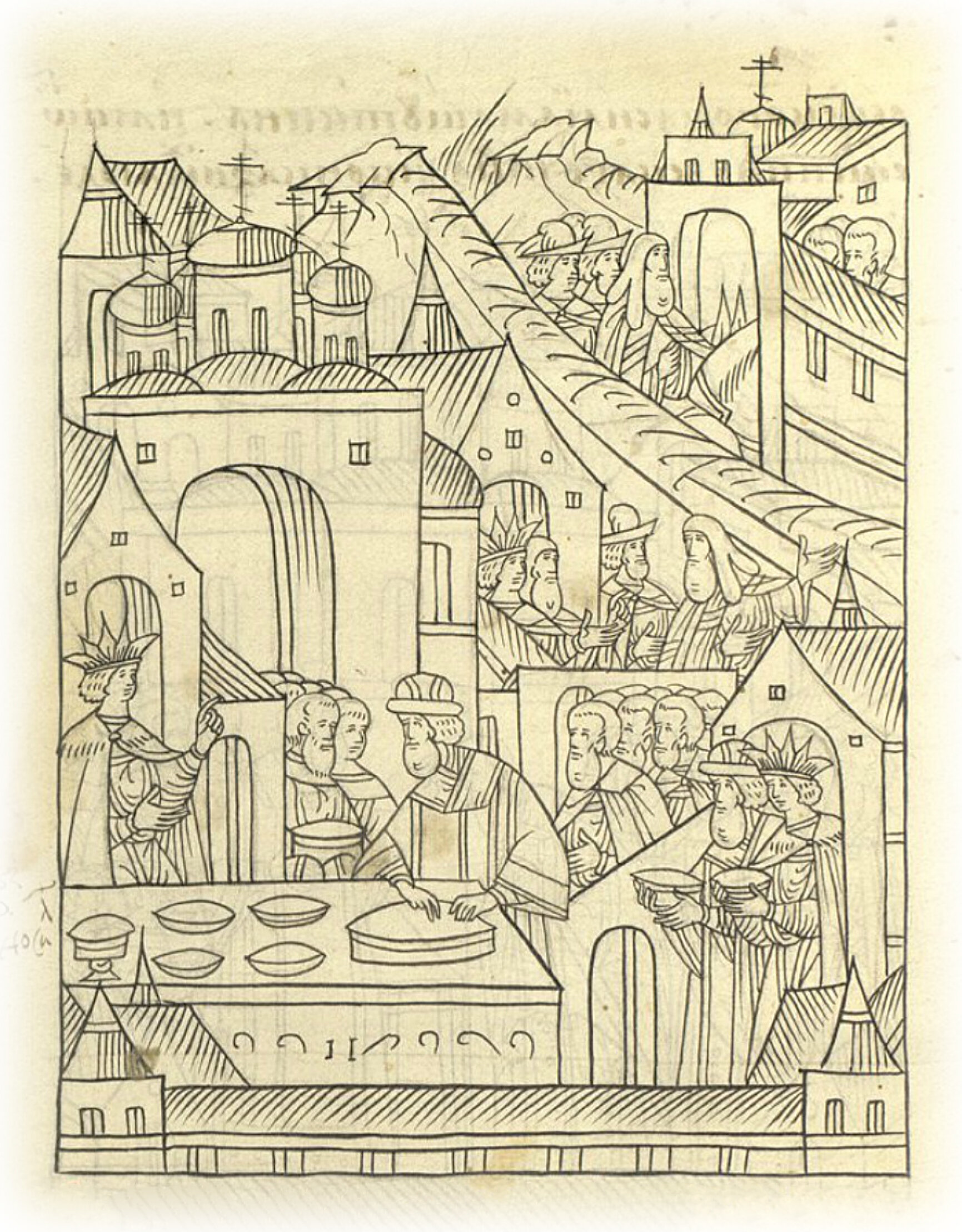 и царь и великий князь всея Руси Иван Васильевич и митрополит Макарий внесли мощи всех святых отцов, да молив Бога и освятив воду, отпустили богомольца владыку Пимина в Новгород. И приехал владыка в Новгород на Николин день. Текст приписки скорописью на полях рукописи: А как пошли бояре в Переднюю избу, царь и великий князь выслал за ними боярина своего князя Владимира Ивановича Воротынского и иных своих бояр, а с крестом выслал дьяка своего Ивана Михайлова. И бояре пошли целовать (крест). И когда пошли бояре целовать (крест), у креста стоял боярин князь Владимир Иванович Воротынский, а дьяк Иван Михайлов крест держал. И как пошли целовать, пришел боярин князь Иван Иванович Пронской Турунтай да начал говорить князю Владимиру Воротынскому: «Твой отец, да ты после великого князя Василия первые изменники, а ты приводишь к кресту». И князь Владимир ему отвечал: «Я изменник, а тебя привожу к крестному целованию, чтобы ты служил государю нашему и сыну его царевичу князю Дмитрию. А ты честен, а государю нашему и сыну его царевичу князю Дмитрию креста не целуешь и служить им не хочешь». И князь Иван Пронской торопливо целовал. А после того государю сказывал боярин Иван Петрович Федоров, что говорили ему бояре, не хотевшие крест целовать, князь Петр Щенятев, князь Иван Пронской, князь Семен Ростовский: «Ведь нами владеть будут Захарьины, и чем нами будут владеть Захарьины, и нам служить государю малому, а мы будем лучше служить старому–князю Владимиру Андреевичу». Да государю же сказывал окольничий Лев Андреевич Салтыков, что говорил ему, едучи на площадь, боярин князь Дмитрий Иванович Немого: «Бог то знает: нас бояре приводят к целованию, а сами крест не целовали; а как служить малому, обойдя старого? А ведь нами владеть будут Захарьины». А когда привел государь бояр к целованию, то государь велел составить запись целовальную, на чем приводить к целованию князя Владимира Андреевича. И когда запись составили, князь Владимир к государю пришел, и государь ему велел на записи крест целовать. А князь Владимир не захотел, и государь ему сказал: «Знаешь сам: коли не хочешь крест целовать, то (это) на твоей душе; а если что случится, мне до того дела нет». А боярам, которые вечером целовали (крест), государь сказал: «Бояре, я не могу, мне не до того, а вы на чем мне и сыну моему Дмитрию крест целовали, вы по тому и поступайте».