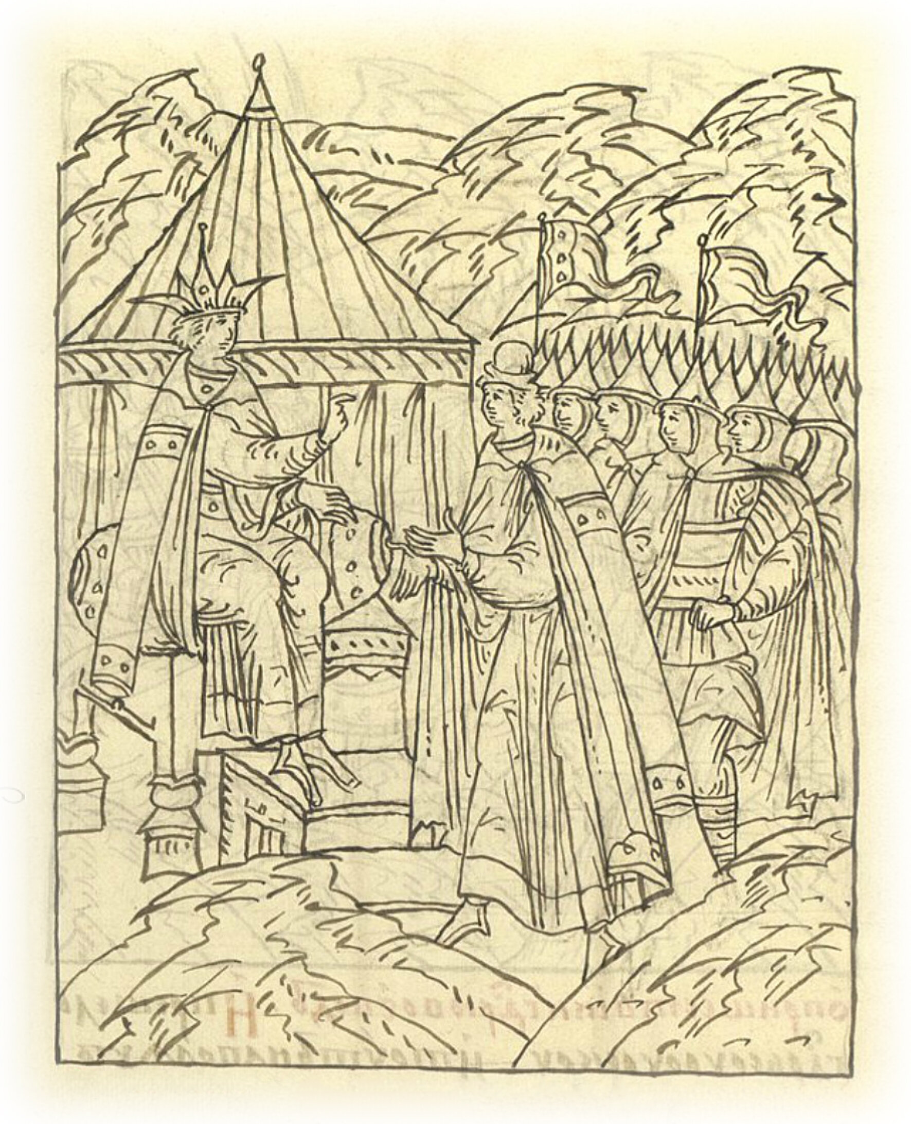 И государь велел передовому полку перед своим полком за ертоулом идти, а (полку) правой руки велел идти справа от себя; а большому полку велел идти позади своего полка, а за ним сторожевому полку; а (полку) левой руки велел государь идти от своего царского полка слева. 15 стан - на речке на Кивате; тут царь благочестивый дневал