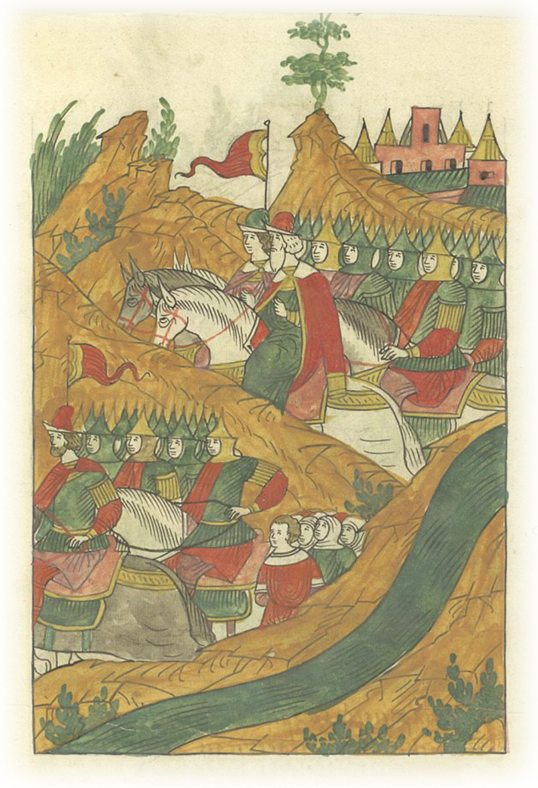 Воеводы царя Ивана Васильевиче Иван Дмитриевич Бельский и Василий Михайлович Глинский догоняют крымских людей на Поле, на Дону.