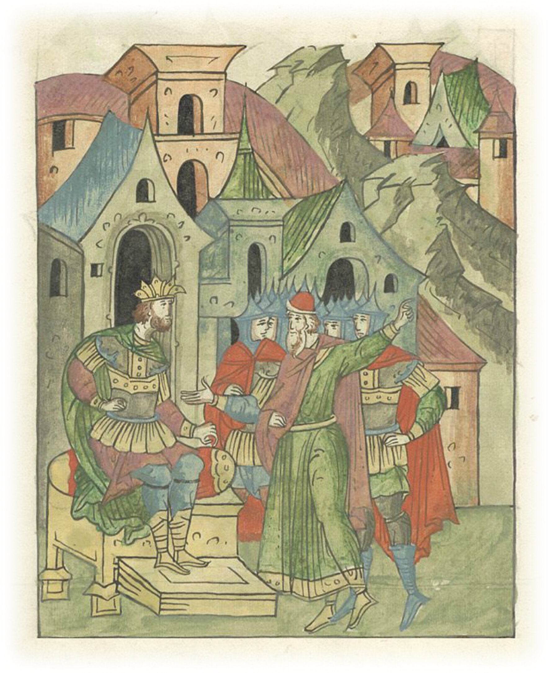 Ругодивские посадники Яким и Захар приезжают в Москву. Воеводы царя Ивана Васильевича Алексей Адашев и Иван Михайлов сообщают им, что государь пожалует их, если сдадут его воеводам помимо Ругодива Вышгород.