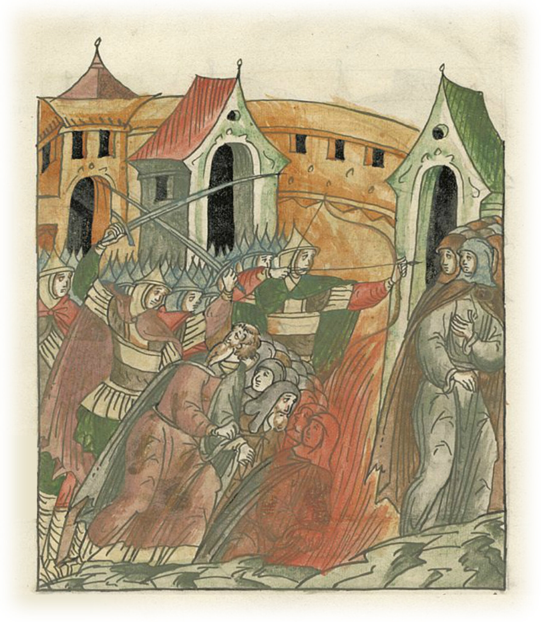 и чернецов, и черниц, и священников похватав, одних рассекали мечом, а других стрелами стреляли и в огонь бросали,