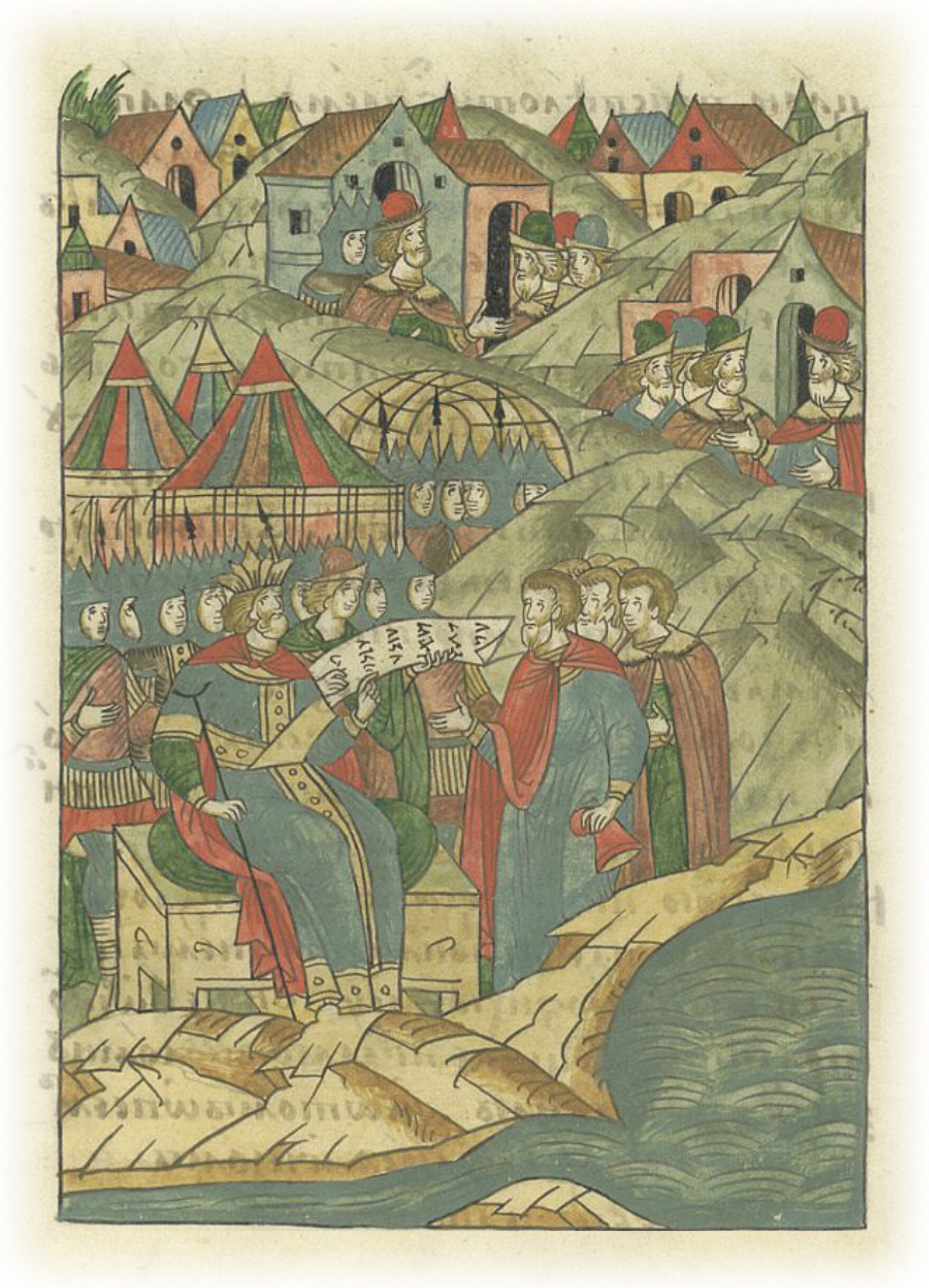 Князь Олег Рязанский, узнав, что Мамай с войском кочует в его земле и собирается идти на великого князя Дмитрия Ивановича Московского, посылает к Мамаю посла с дарами и письмом, в котором присягает в верности ему, жалуется на Дмитрия Ивановича и просит ми