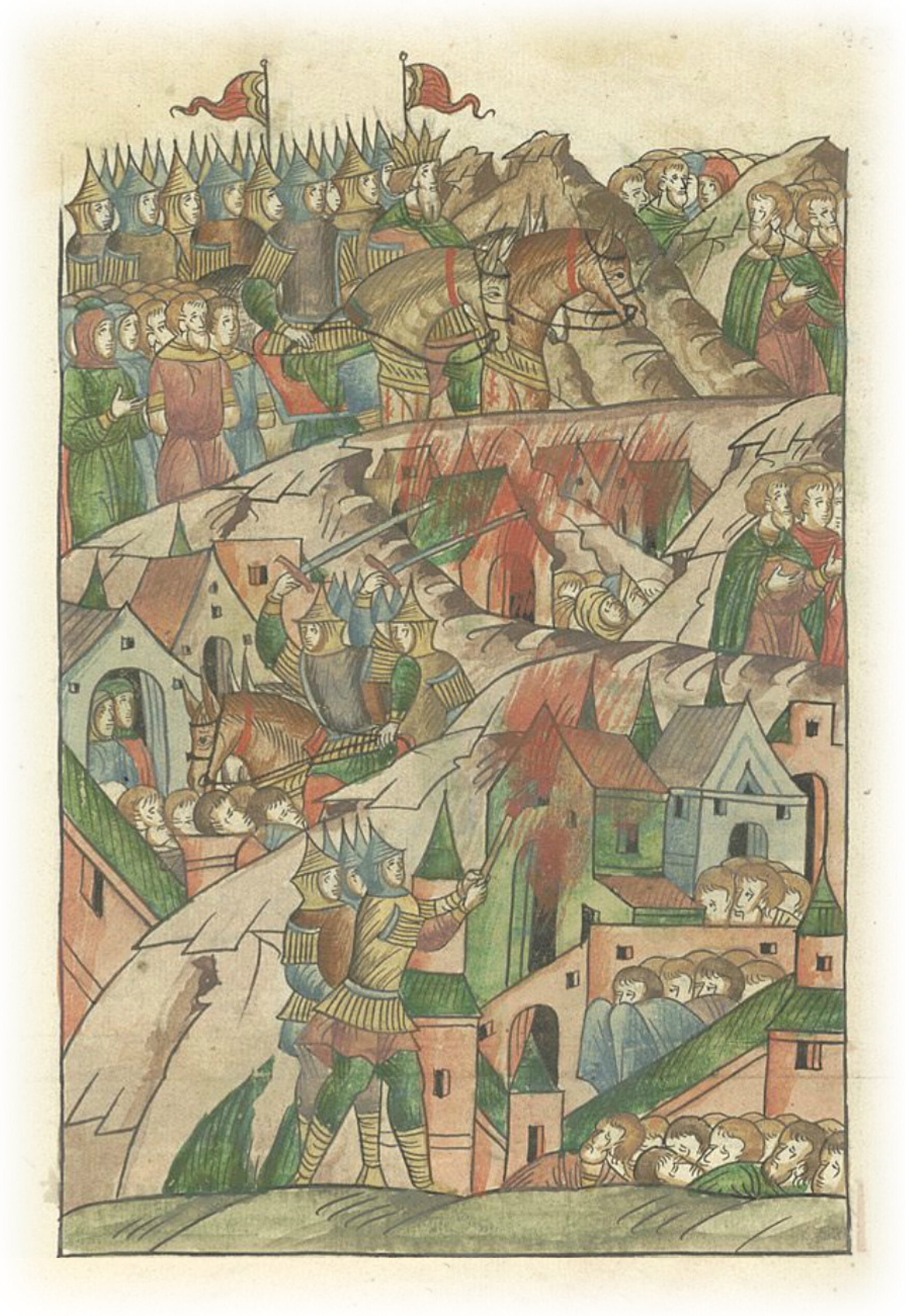 и взял землю Рязанскую, и огнем пожег, а людей посек, а иные разбежались, а иных в полон повели в Орду - многое множество рязанцев.