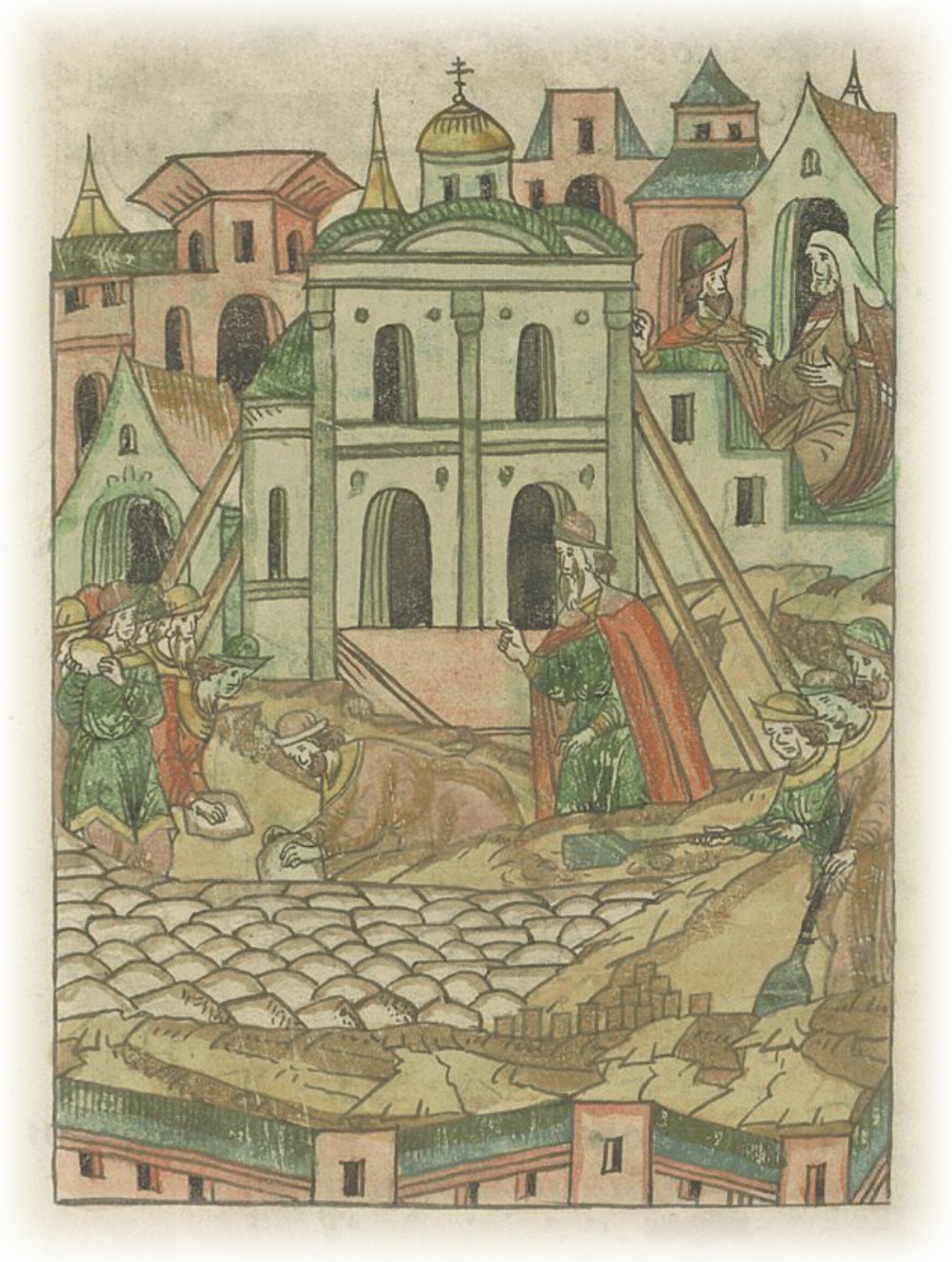 и взялись за дело. А та (прежняя) церковь стала ветха, и сдвинулись своды ее, которые подкреплены были деревом. Начали же рвы копать в апреле месяце; выкопав же рвы, прежде деревом на дно набили, потом поверх того камнями рвы те наполнили.