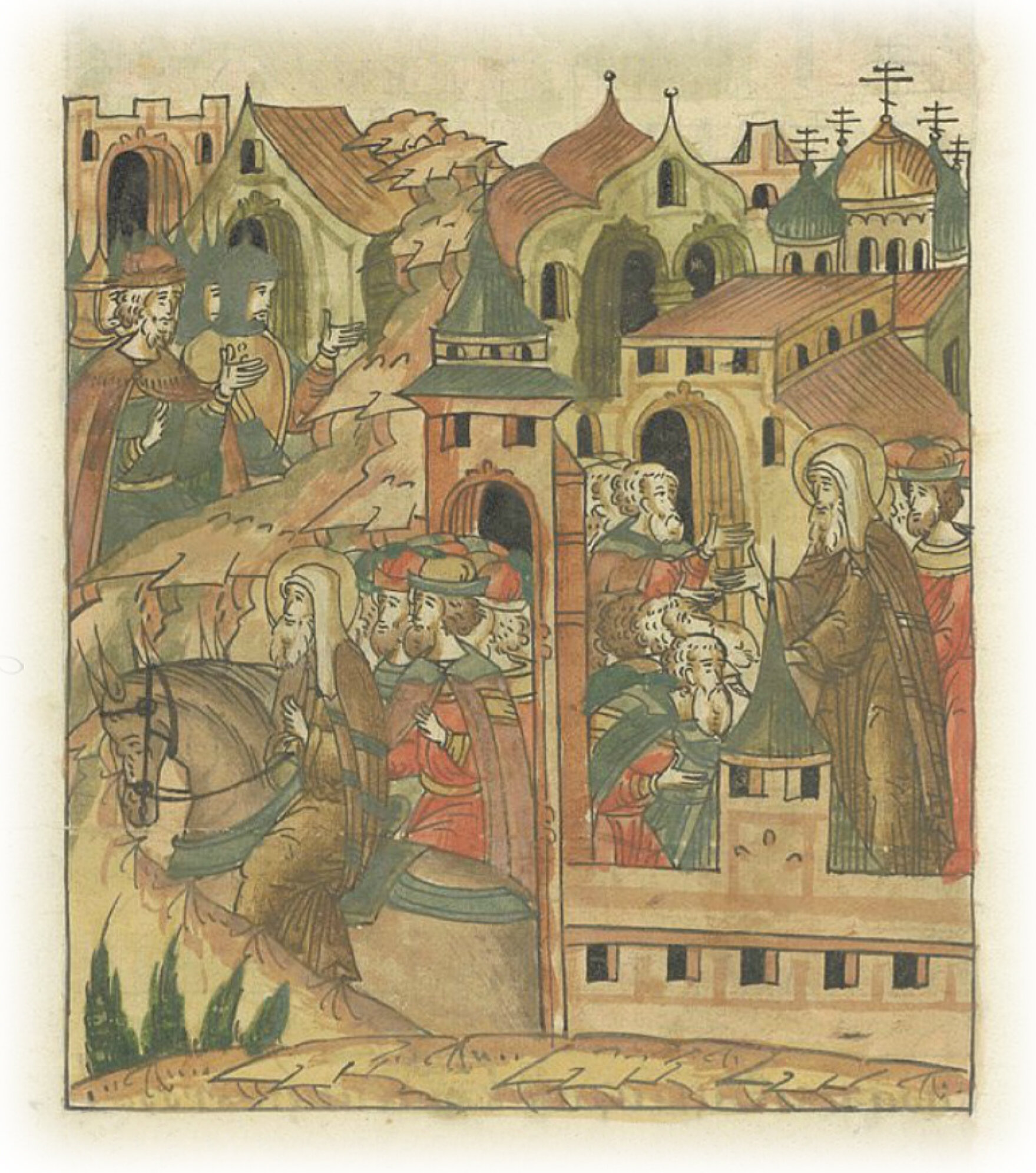 решили бить челом архиепископу своему Евфимию, чтобы шел и молил великого князя, пусть помилует отчину свою и отвратит себя от гнева ярости своей, чтобы до конца не погибли за свою измену к нему, господину своему великому князю. Архиепископ же, видя людей в беде, обратился к ним: «Дети мои, за ваше нарушение договора и за свое согрешение нельзя мне идти к господину моему великому князю. Но милостив я: иду молить его, пусть простит нам это зло, если не только изменили ему, но и руку вашу подняли против него». И пошел к великому князю, а с ним посадники и тысяцкие, и мужи, как у них было принято.