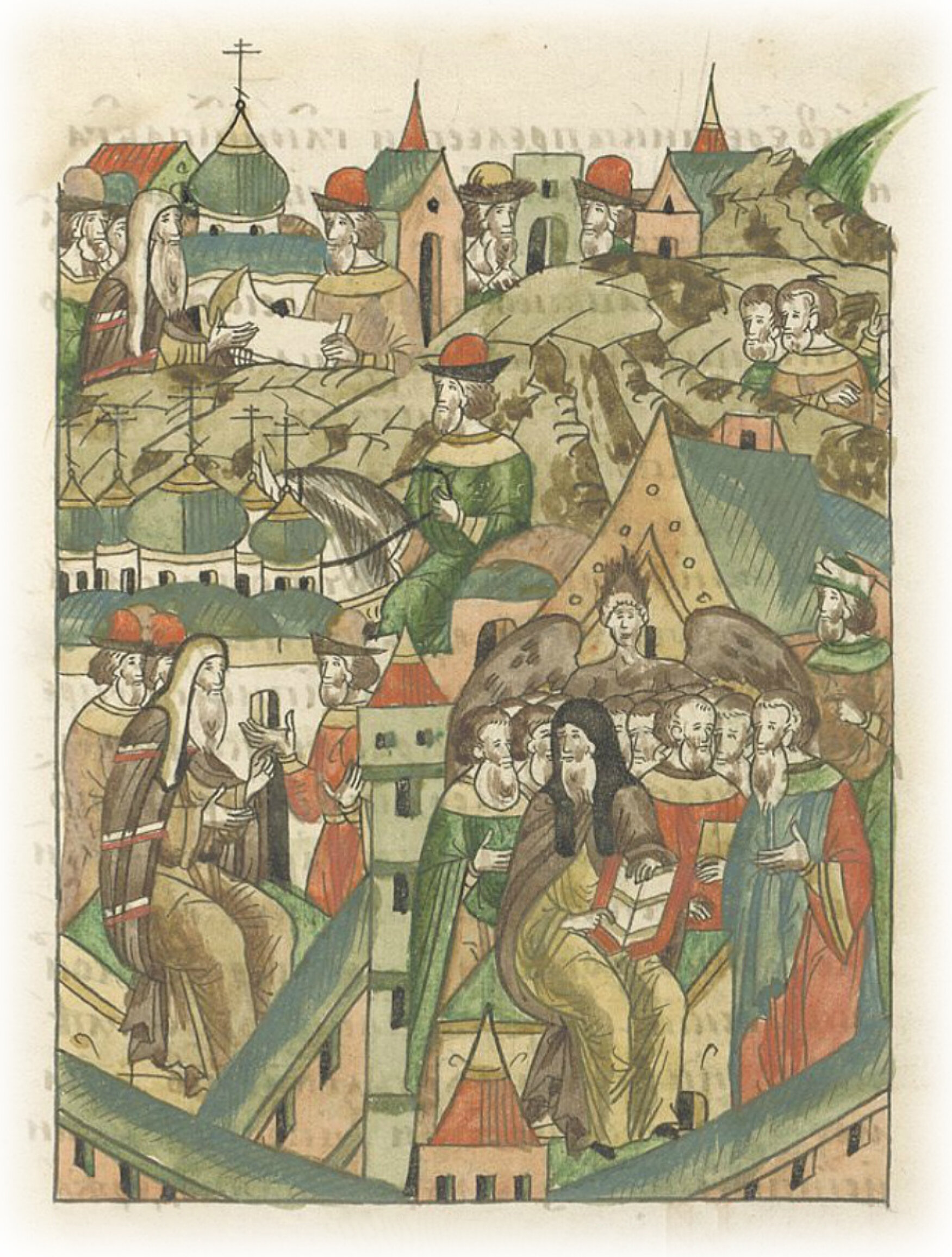 Собор в Москве против новгородских еретиков. Тогда же произошло следующее событие в Великом Новгороде: вражьим наветом многое смущение от некоего жидовина охватило слабых во многом людей, в которых явно вселился сам дьявол, пагубной его лжи многие из них повиновались, умом развратились и от истины отошли, внимая басням злых людей, еретиков, ложно возводящих неправду на Бога, обратились к иудейским законам, звездочетству и волхованию язычников, отпали от евангельской благодати и истины; и в воплощение Сына Божьего Господа нашего Исуса Христа, Который (воплотился) от Пречистой Приснодевы Марии, не веровали и святым иконам не поклонялись, Тело же и Кровь Христову ни во что не ставили и многие другие ереси и отвратительные дела творили, которые нельзя и описать. Вот имена тех развратников: чернец Захария, софийский протопоп Гавриил и архангельский поп Денис, и ивановский поп Максим, и покровский поп Василий, и дьякон никольский Макар, и дьяк борисоглебский Гридя, и Васюк, зять Денисов, и дьяк никольский Самуха, и прочие с ними. И все эти свои злые ереси они скрывали; Ивашко Максимов и другой Ивашко, сын протопопа Алексея, в бега ударились. Но не утаена была их злоба от архиепископа Геннадия, ибо архиепископ, Богом вразумляемый, многим подвигом, как хитрый ловец многоразличными сетями, уловил злокозненное их действо и злое таинство и о всех их богопротивных ересях подробно разузнал, и всячески старался их исправить. Но, видя их жестокосердный нрав и непокорность, которые не мог один исправить, возвестил об этом в Москве господину и отцу своему преосвященному Зосиме, митрополиту всея Руси. Эти безумные гнилые мудрствования стали известны самому благочестивому великому князю Ивану Васильевичу всея Руси самодержцу, и по его повелению собрался тогда по их поводу собор в Москве.