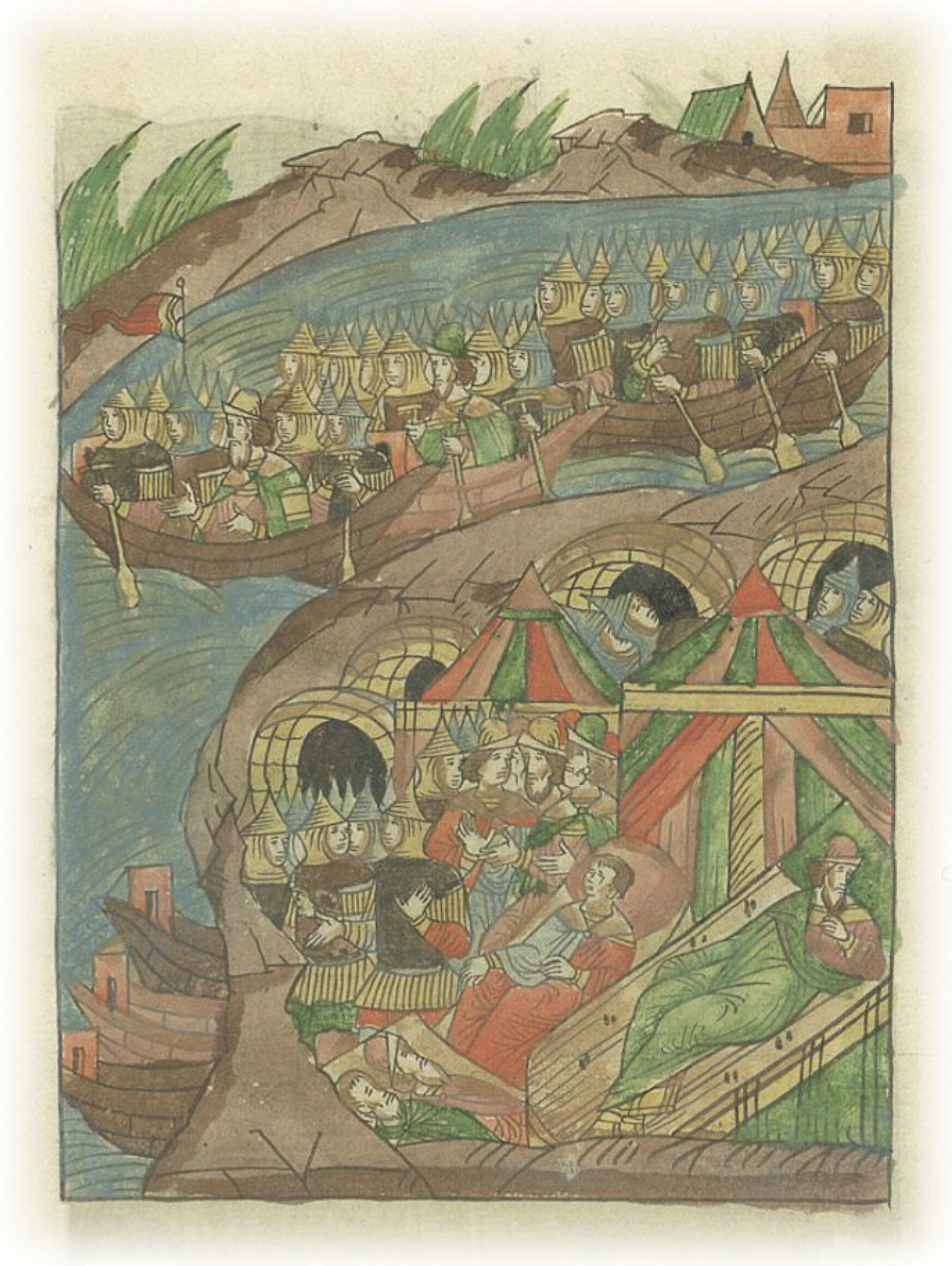 Воины великого князя Ивана Васильевича, отплыв от Новгорода шестьдесят верст, останавливаются на ночлег.