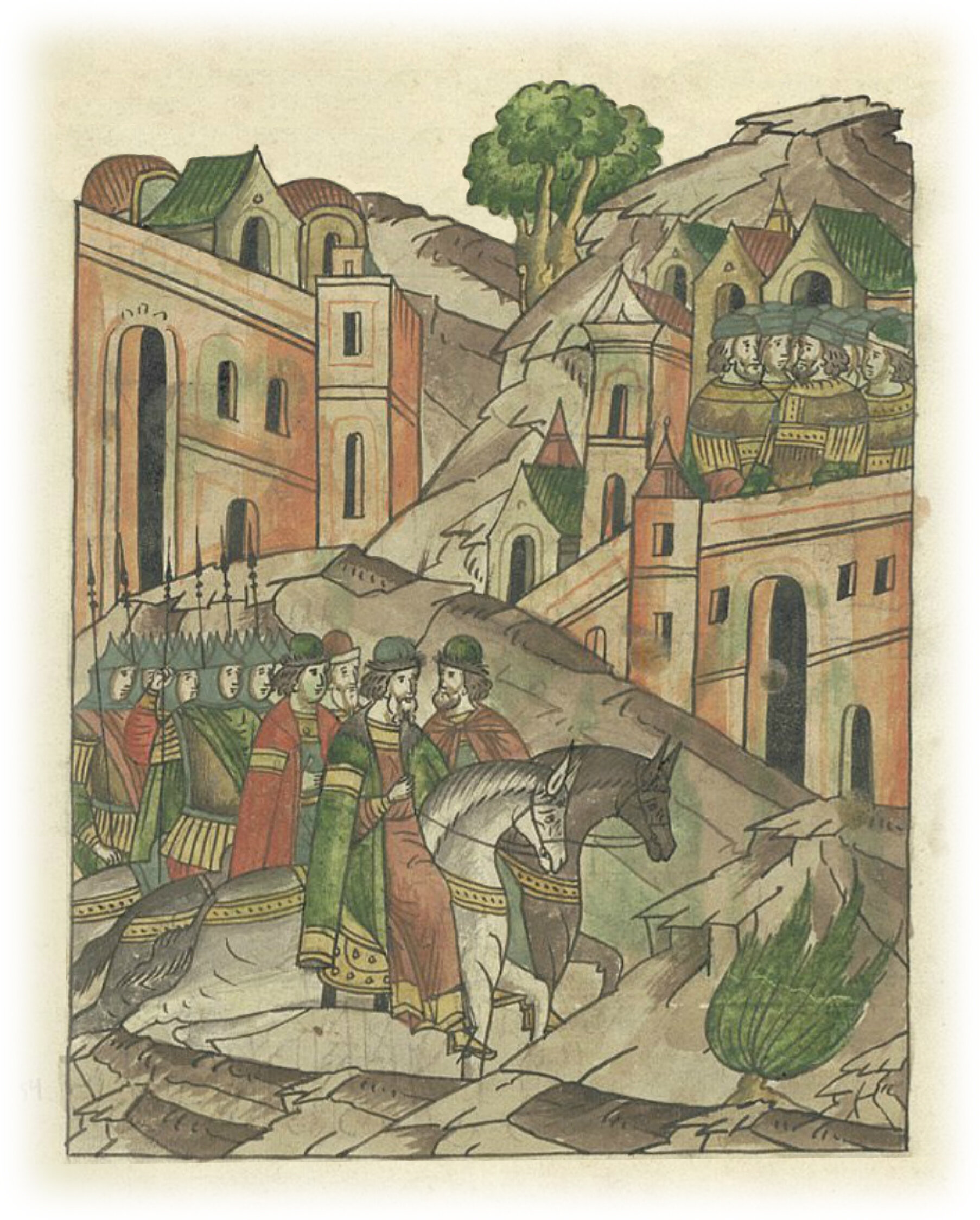 Великий князь Ярослав Ярославич с князем Дмитрием Александровичем, Товтивилом Полоцким и новгородцами идут под немецкий город Юрьев.