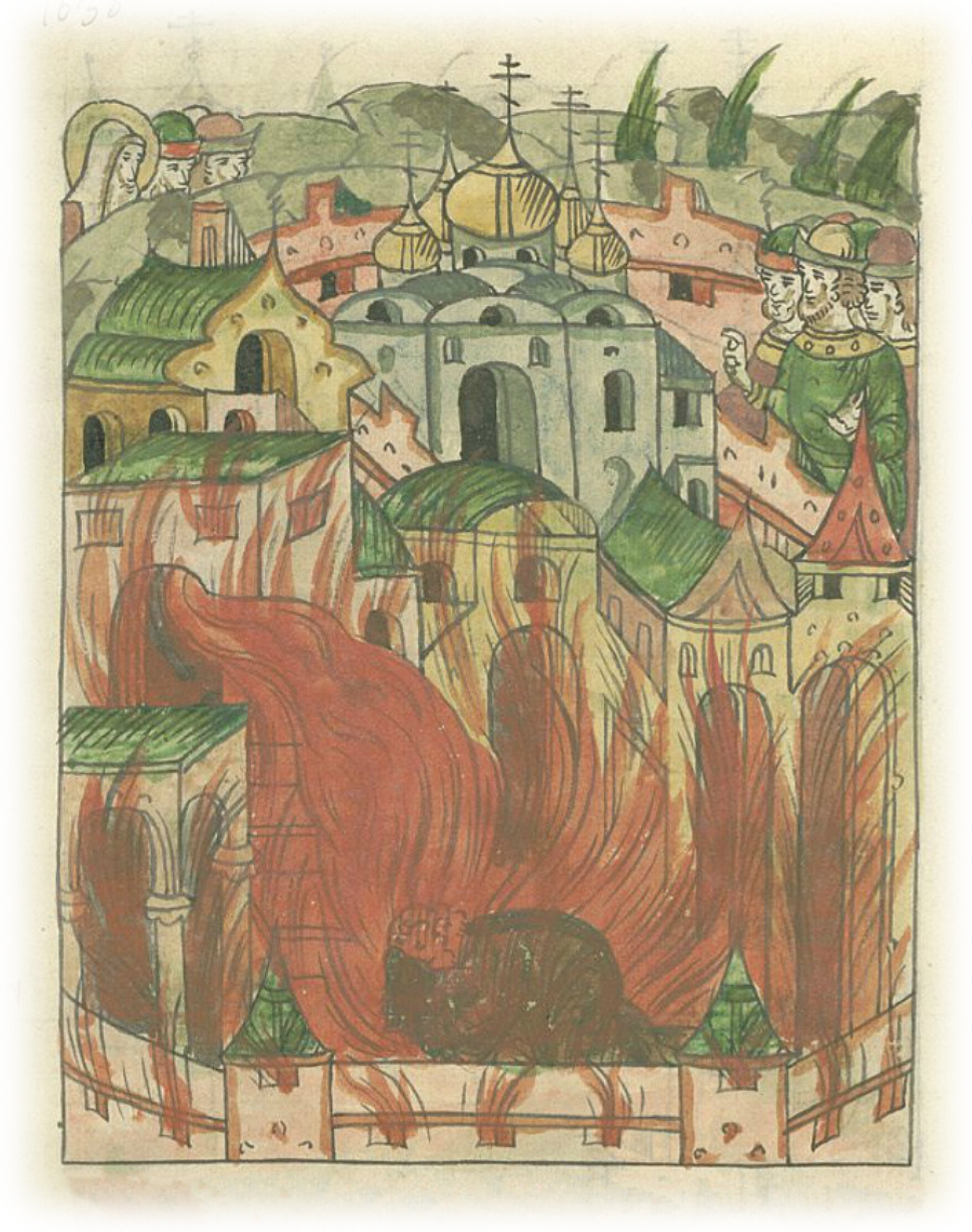 В том же году был пожар в Москве, а на Савву Авраамиева, одного из тех клеветников, которые клеветали на митрополита Фотия, огонь, как облако, полыхнул от горницы Фотия и сжег его заживо.
