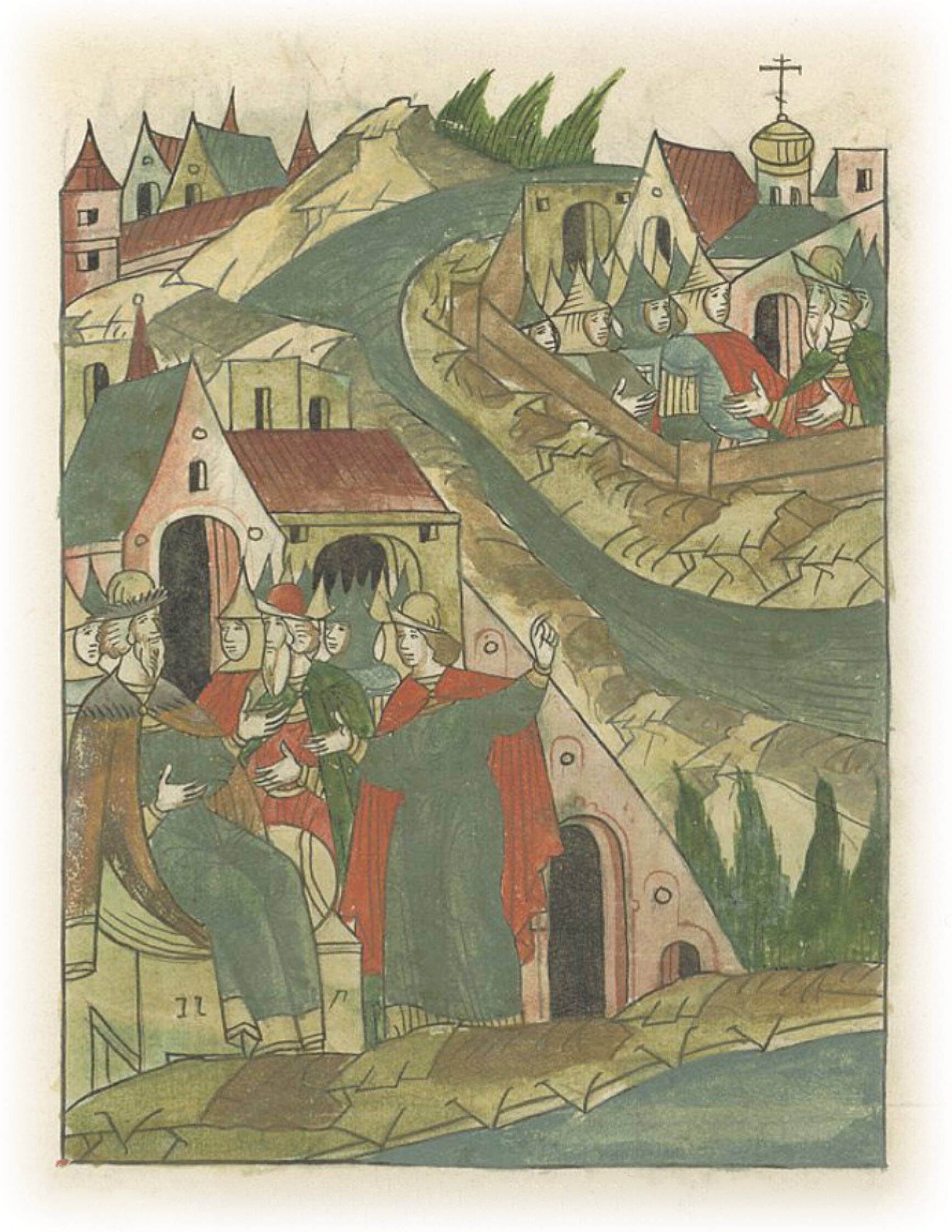 Ругодивские посадники Яким и Захар приезжают в Москву. Воеводы царя Ивана Васильевича Алексей Адашев и Иван Михайлов сообщают им, что государь пожалует их, если сдадут его воеводам помимо Ругодива Вышгород.