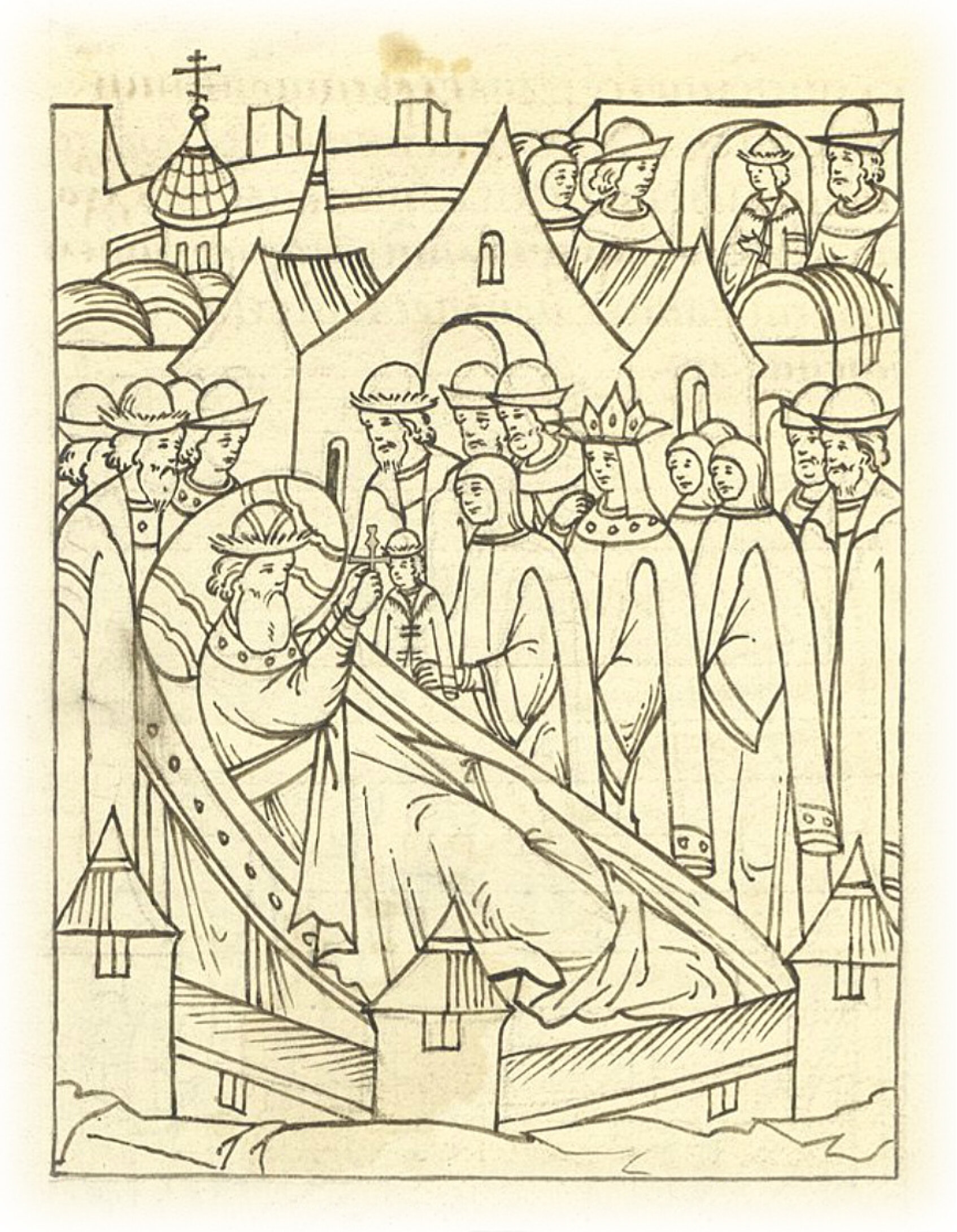 И принесли князя Юрия, и тут благословил сына своего Георгия крестом, ибо тогда князь Юрий был очень мал, одного года; и возложил на него крест золотой Паисеинской, и приказал отнести тот крест после кончины своей боярину своему Михаилу Юрьевичу; да и вотчиною его пожаловал, завещал ему в наследие город Углич и прочие города и волости по достоянию.