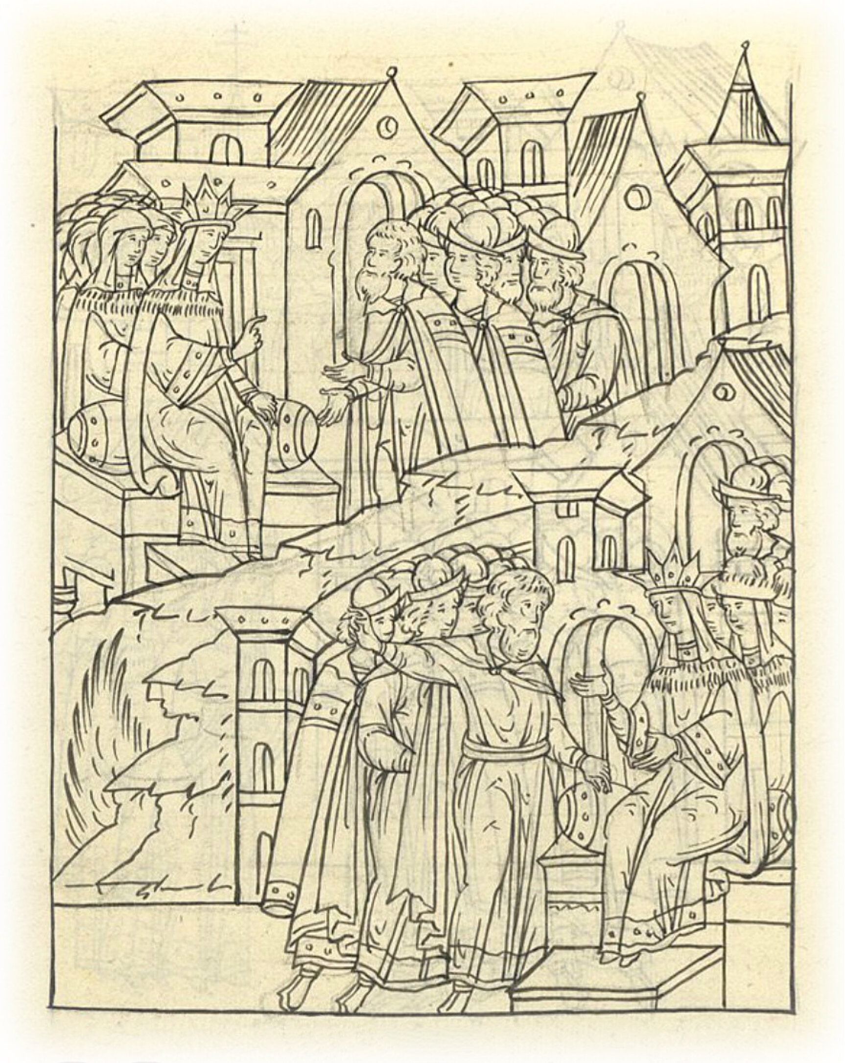 Ругодивские посадники Яким и Захар приезжают в Москву. Воеводы царя Ивана Васильевича Алексей Адашев и Иван Михайлов сообщают им, что государь пожалует их, если сдадут его воеводам помимо Ругодива Вышгород.
