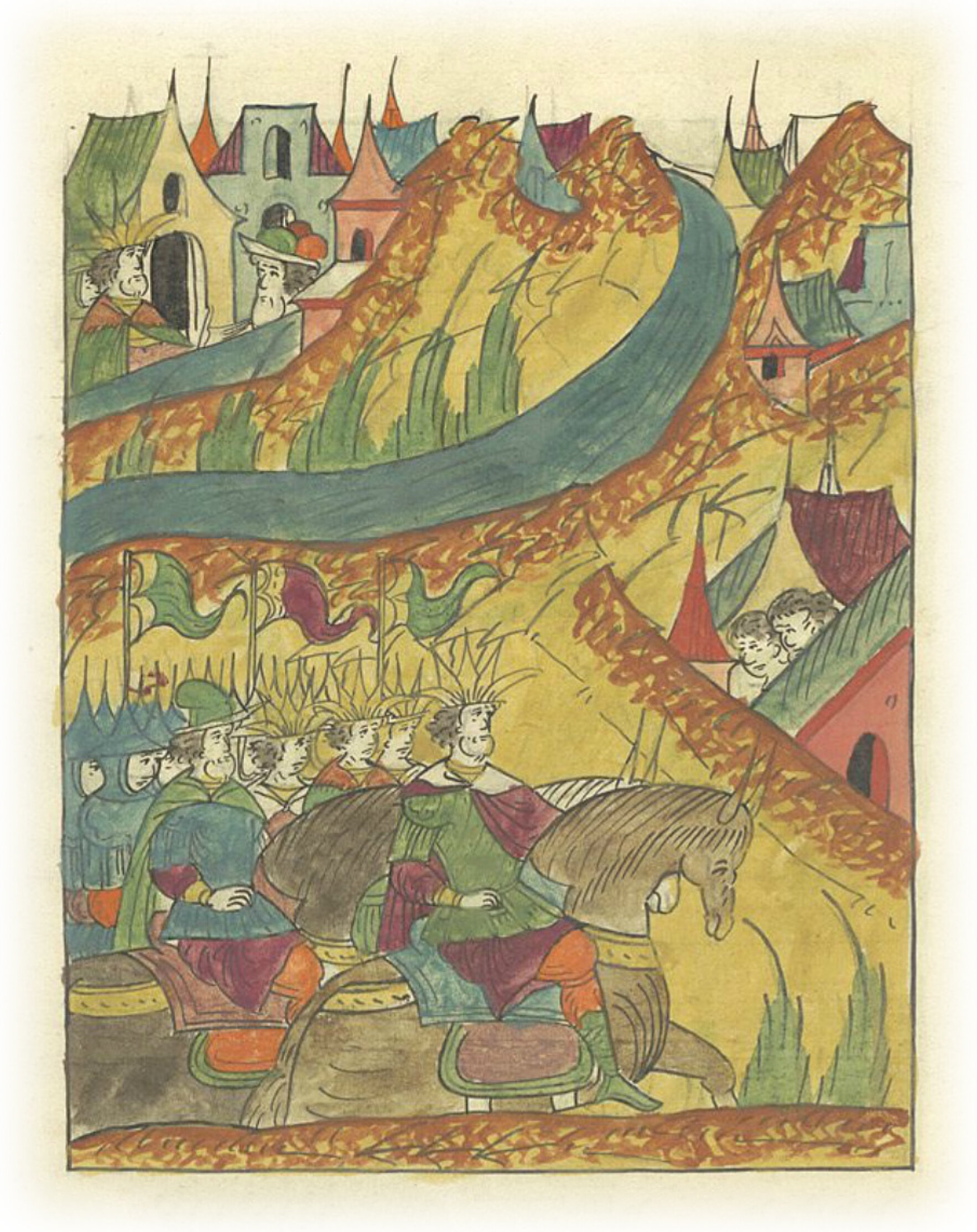 И пришел царь Девлет-Кирей с детьми своими с калгой Магмет-Киреем царевичем и с Алды-Гиреем царевичем и со всеми людьми на окраину царя и великого князя, на Рязанскую землю, скрытно и хотел идти к Оке-реке и через реку переправляться.