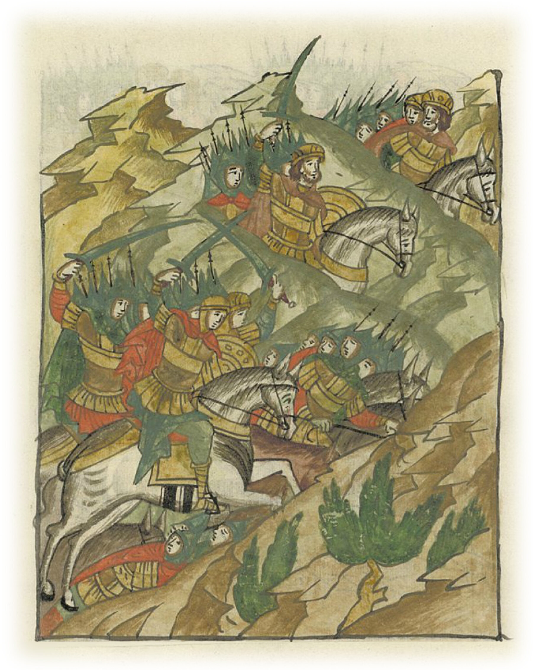 а вернулись и ударили в тыл полку Мстислава, и затоптали его; Мстислава же в то время не было там, он с передними воинами погнался за полком Олега,