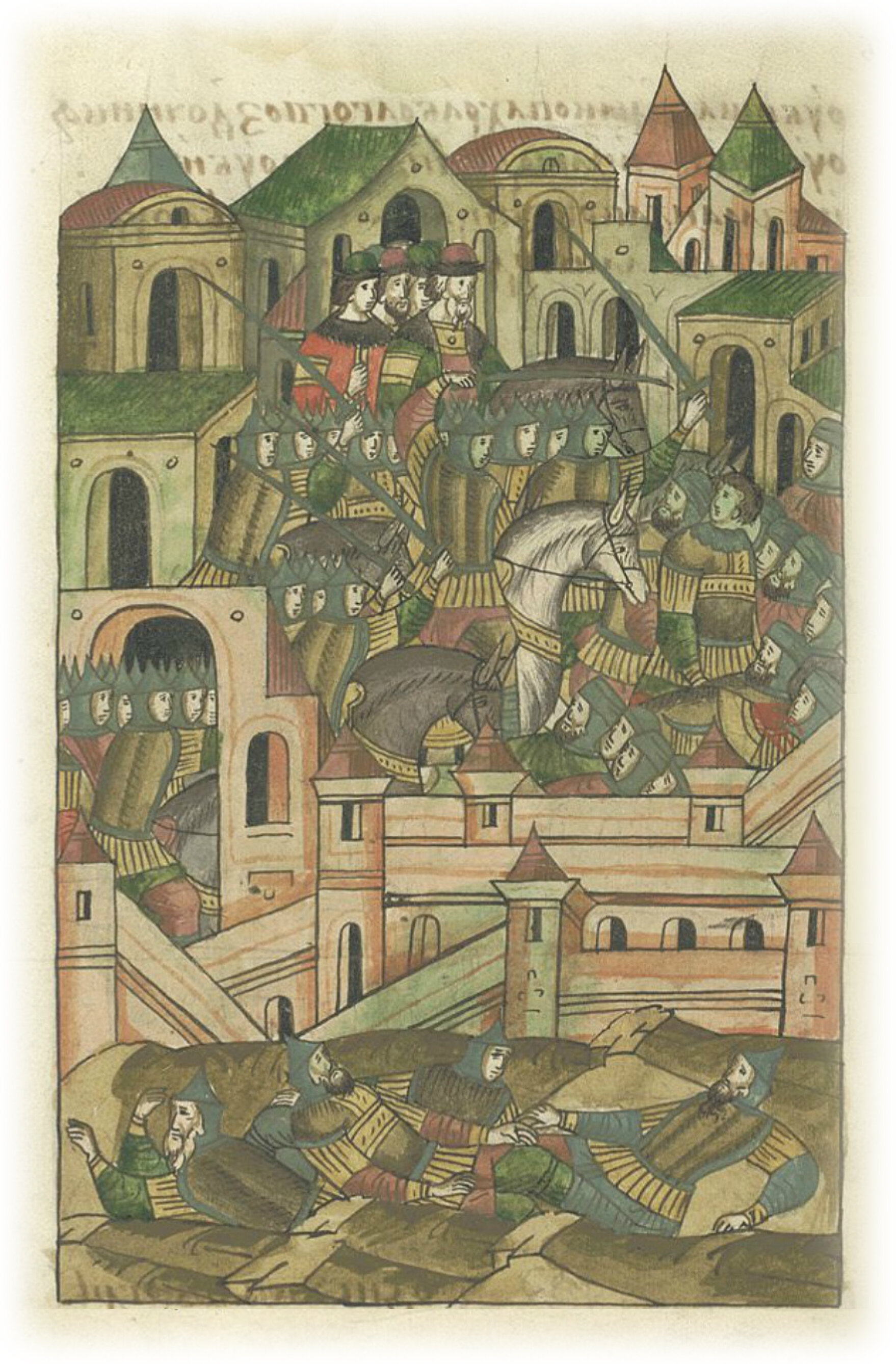 А у города три стены; и так вскоре одним приступом город взяли и немцев избили, а наших мужей добрых и весьма храбрых застрелили с городской стены, и Петра Мясниковича убили, и Иакова храброго гвоздочника убили, и Илью Дегтярева убили, и Измаила кузнеца убили, очень храбрых и весьма удалых мужей.