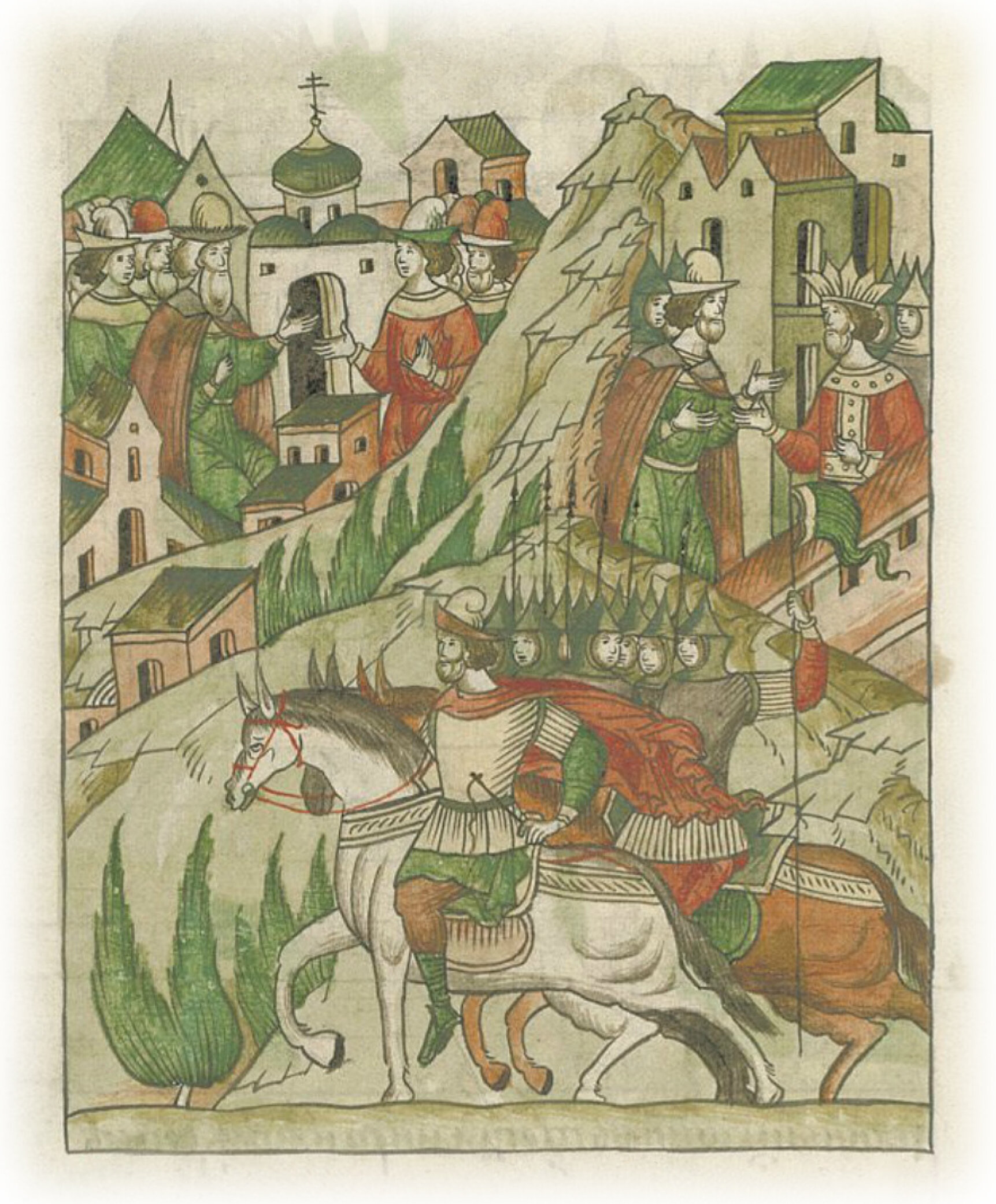 Так нечестивый вместо братства, дружбы и любовного завета на кровопролитие приготовился советом посла своего беззаконного Апака-мурзы, собрав многое свое безбожное воинство, с ним же была и литовская сила, и черкасы, и нагайские татары, которых тогда завоевал.
