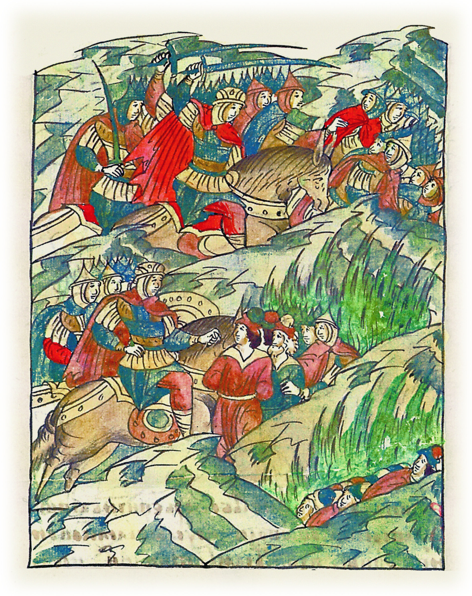 Воеводы царя Ивана Васильевича, разделившись, идут в погоню за царем Емгурчеем.