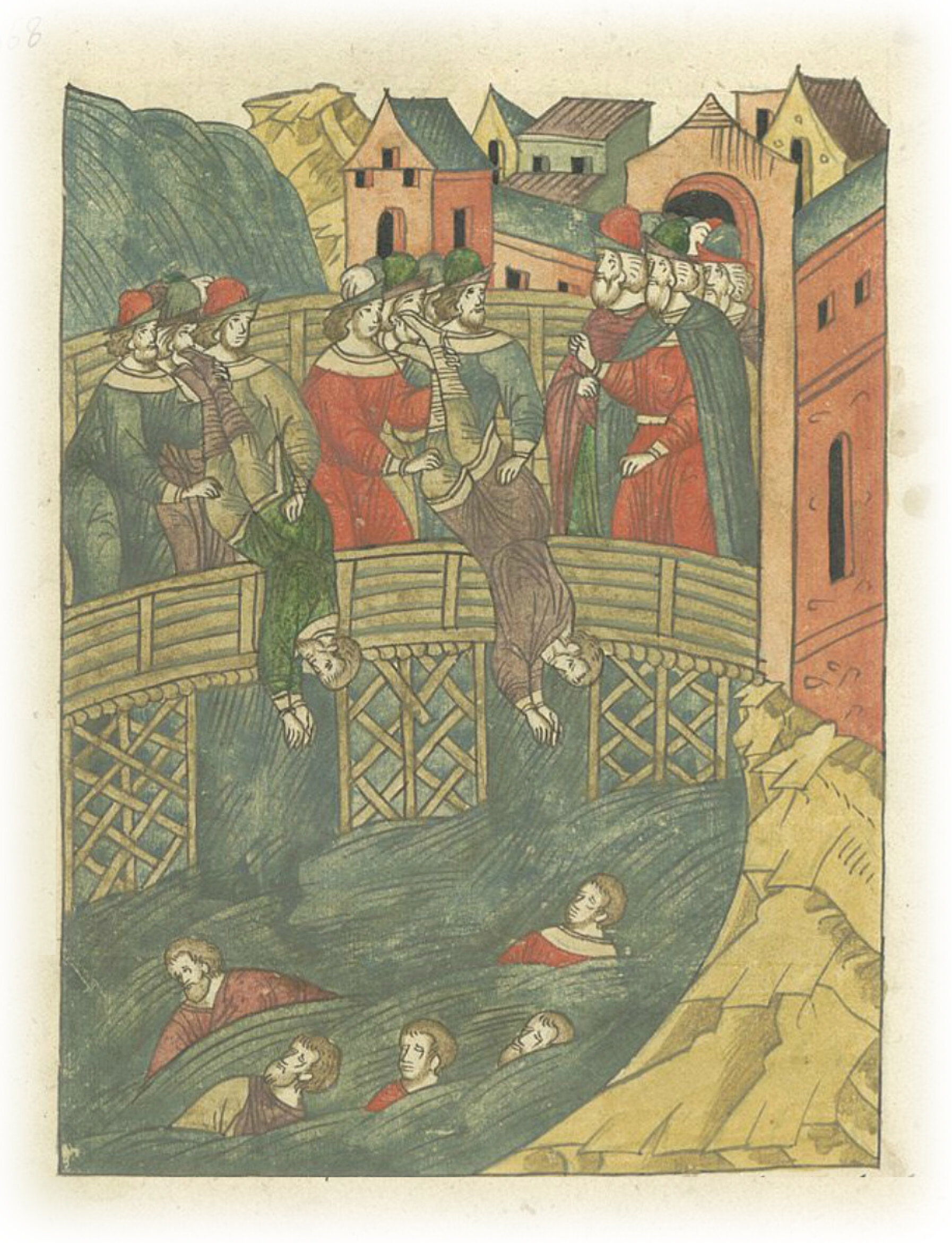Новгородцы бросают в реку Волхов еретиков-стригольников.