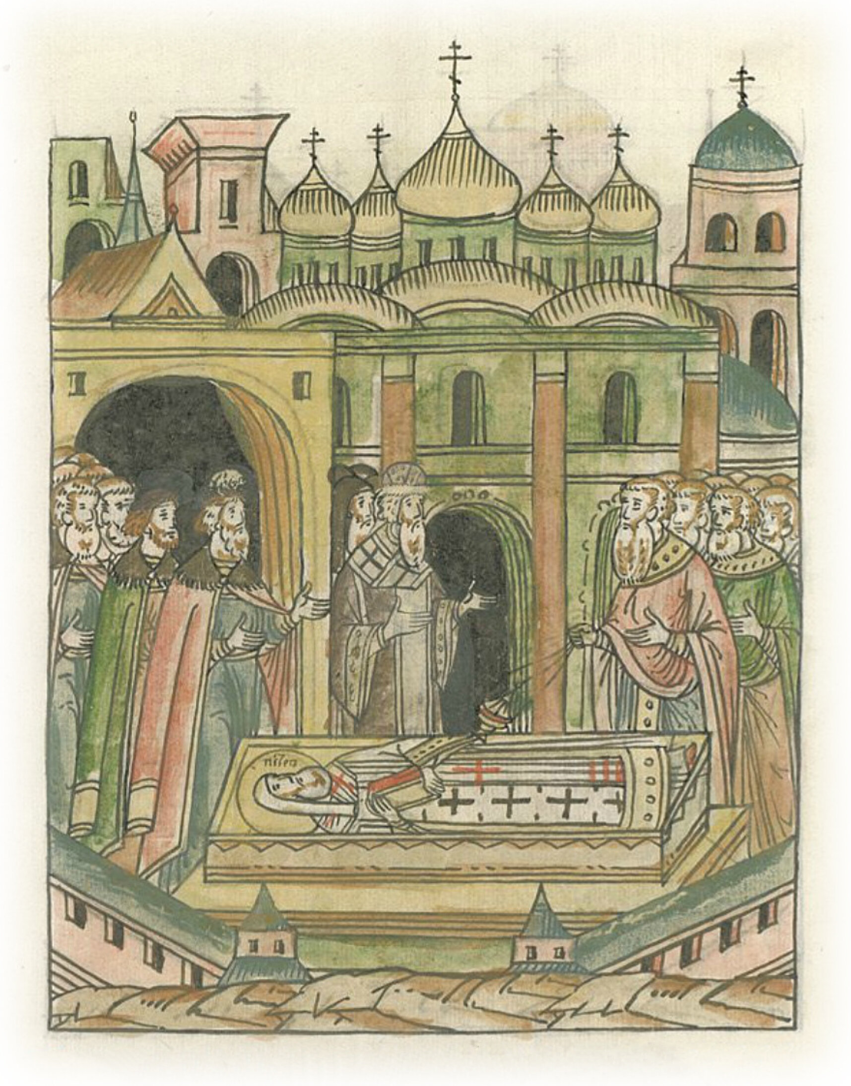также и великий князь с сыном своим, и прочие все, как прежде было сказано, и начали утреню петь, как и на преставление чудотворца Петра, которое приходится на 21 декабря, и с восхвалением перед седьмою песнью, и прочее по обычаю, и отпуст.