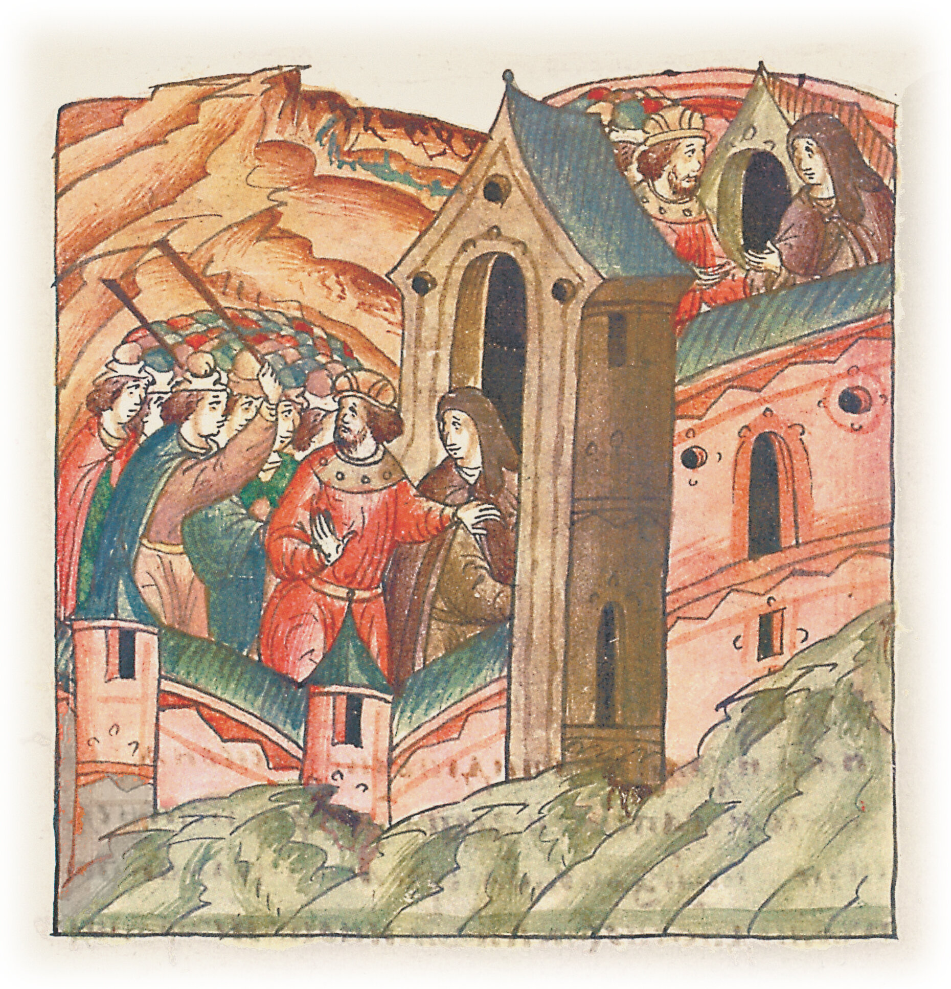 Киевляне приходят в монастырь святого Феодора, чтобы убить князя Игоря Олеговича. Князь Владимир Мстиславич пытается отговорить их совершать убийство инока.