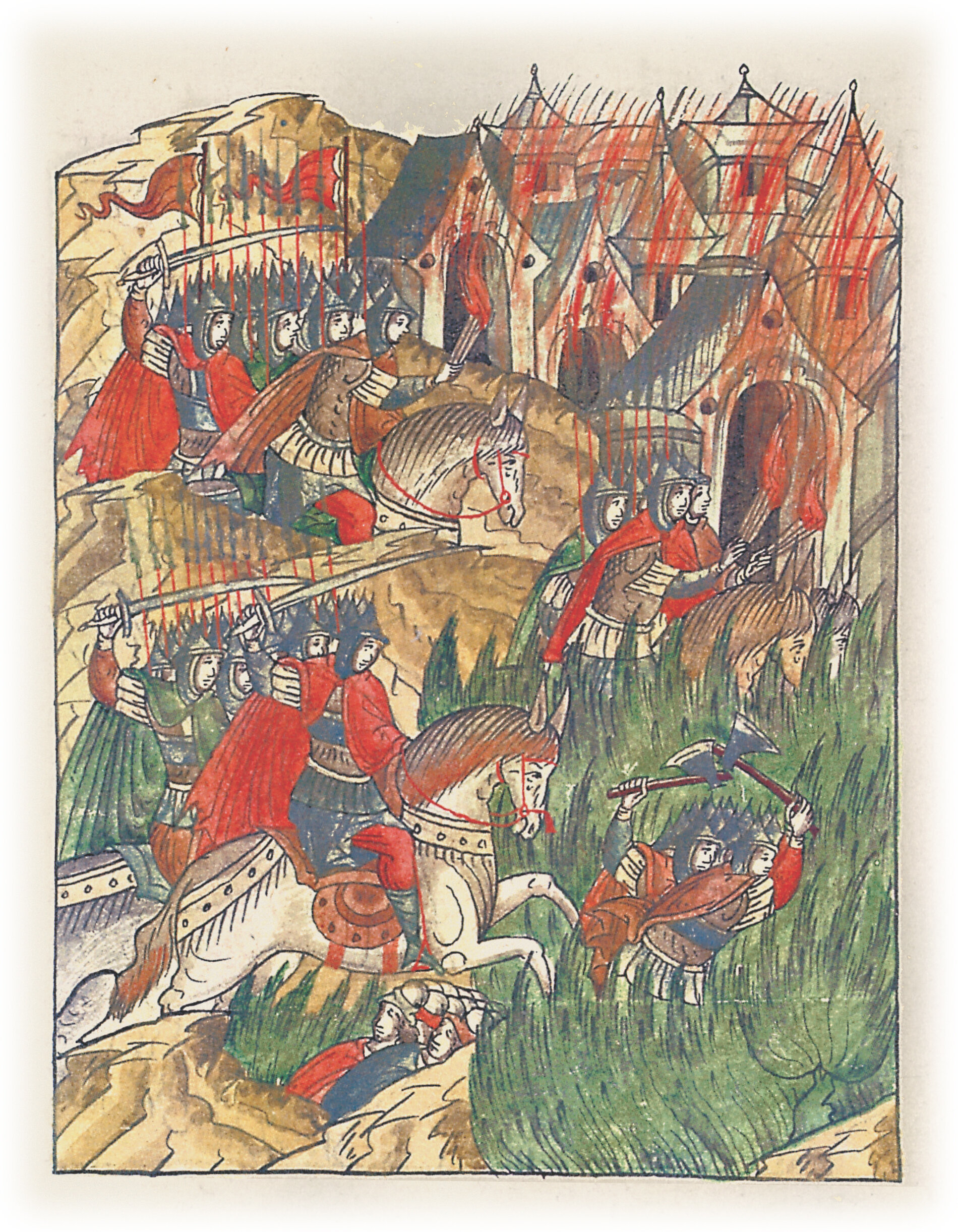 в то время подоспели берендеи с кибитками своими и с торками, и все черные клобуки, и большую пакость сотворили: и волости и села пожгли, и виноградники вырубили и опустошили.