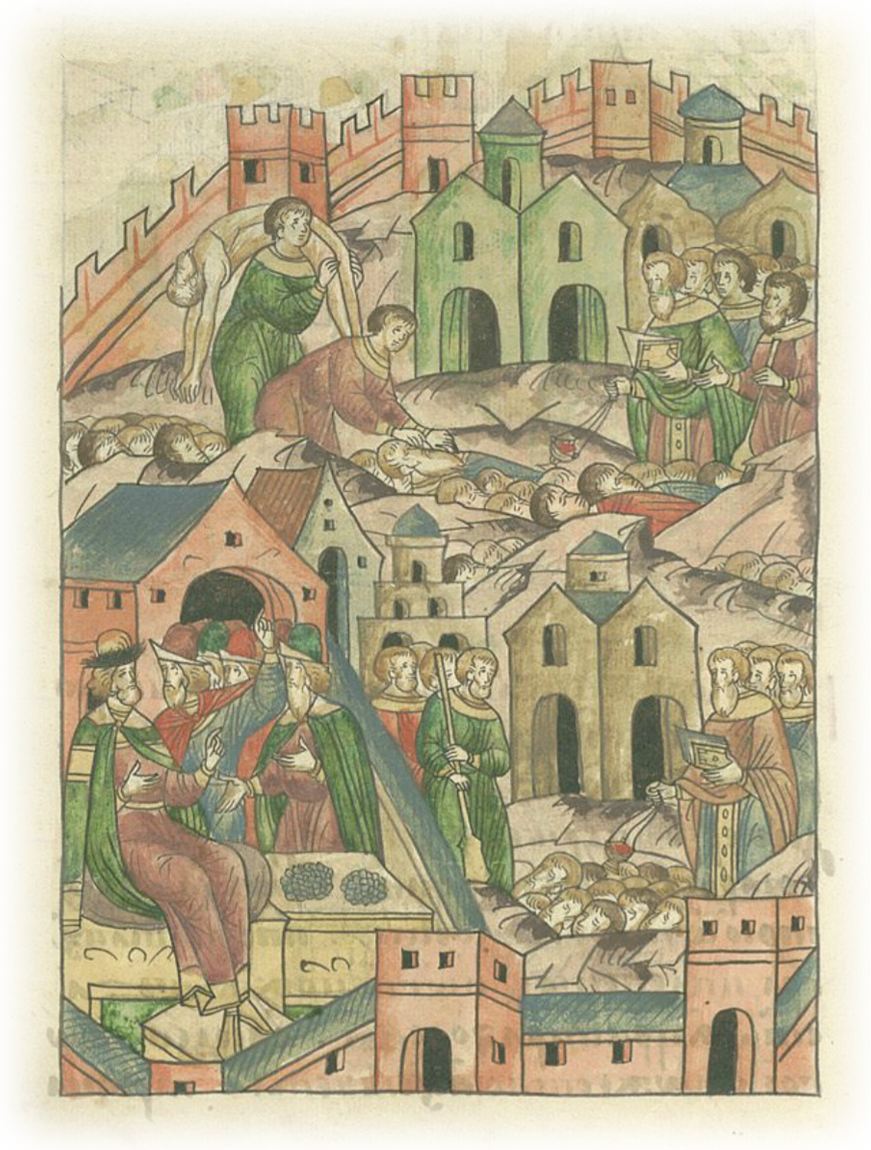 Великий князь Дмитрий Иванович и князь Владимир Андреевич, приехав в разоренную Москву, велят хоронить тела убитых татарами людей.