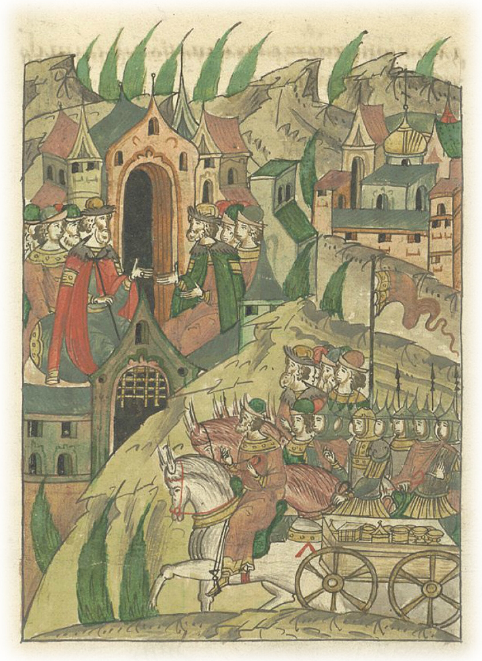 Ругодивские посадники Яким и Захар приезжают в Москву. Воеводы царя Ивана Васильевича Алексей Адашев и Иван Михайлов сообщают им, что государь пожалует их, если сдадут его воеводам помимо Ругодива Вышгород.